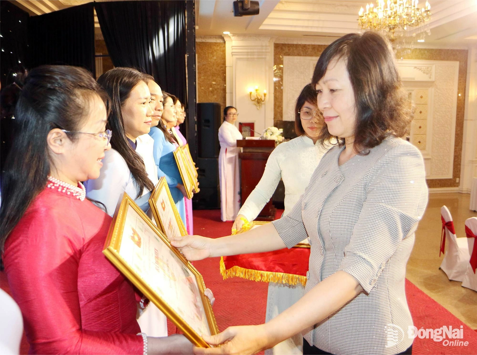 | Đồng chí Huỳnh Thị Hằng, Phó Bí thư Tỉnh ủy, Chủ tịch Ủy ban MTTQ Việt Nam tỉnh Đồng Nai trao bằng khen của Ban Thường trực Ủy ban MTTQ Việt Nam tỉnh Đồng Nai cho các tập thể có thành tích xuất sắc trong công tác Mặt trận và xây dựng khối đại đoàn kết toàn dân tộc năm 2025. Ảnh: Văn Truyên |