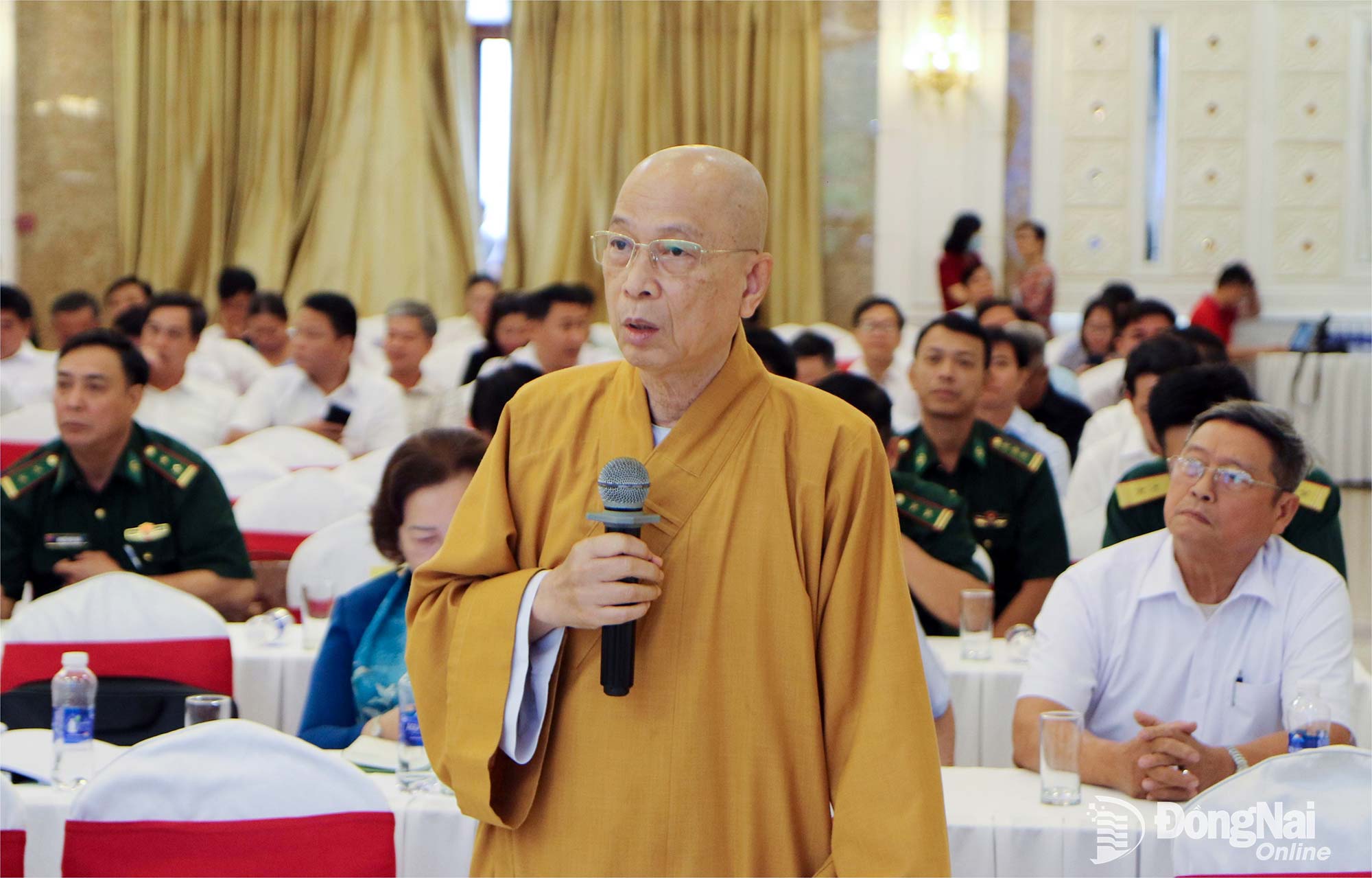 | Thượng tọa Thích Huệ Khai, Trưởng ban Trị sự Giáo hội Phật giáo Việt Nam tỉnh Đồng Nai phát biểu tại hội nghị. Ảnh: Văn Truyên |