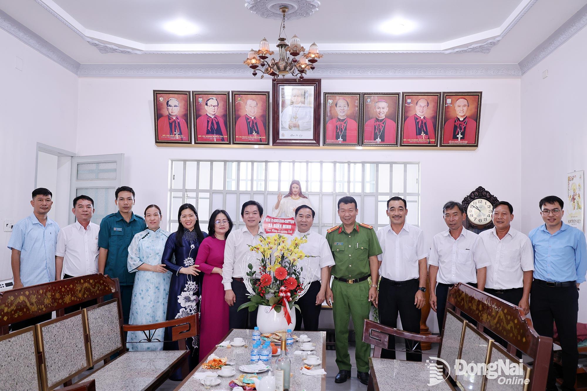 | Đoàn đến thăm và tặng hoa chúc mừng tại Giáo xứ Xuân Long. Ảnh: Nhật Quang |