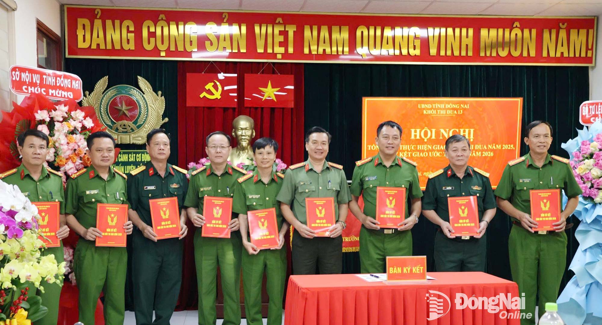 | Đại diện các đơn vị trong khối thi đua 13 UBND tỉnh Đồng Nai ký giao ước thi đua năm 2026. Ảnh: ĐVCC |
