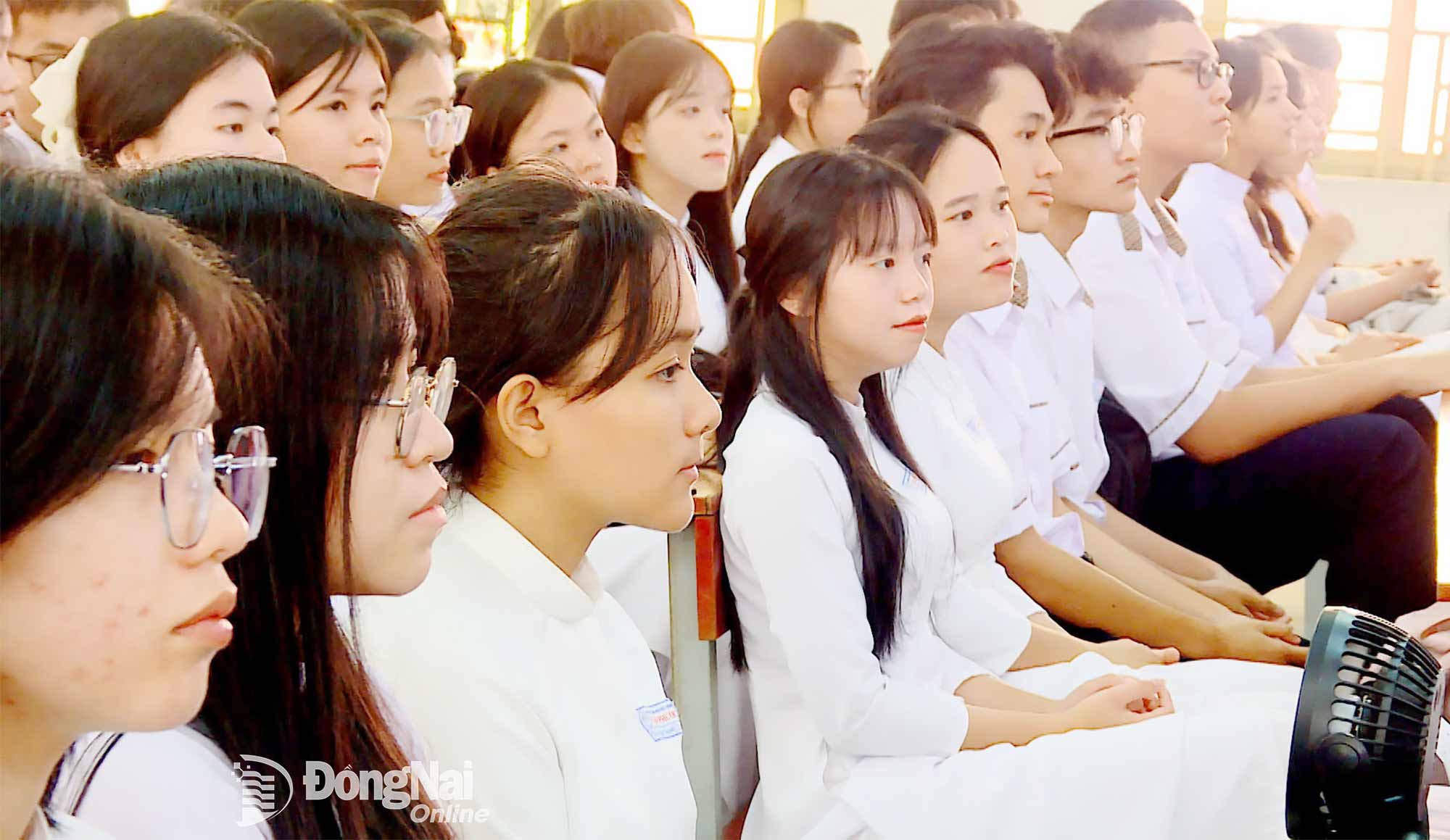 | Học sinh Trường THPT Tam Phước dự lễ họp mặt kỷ niệm 43 năm ngày Nhà giáo Việt Nam 20-11. Ảnh: Nhất Phương |