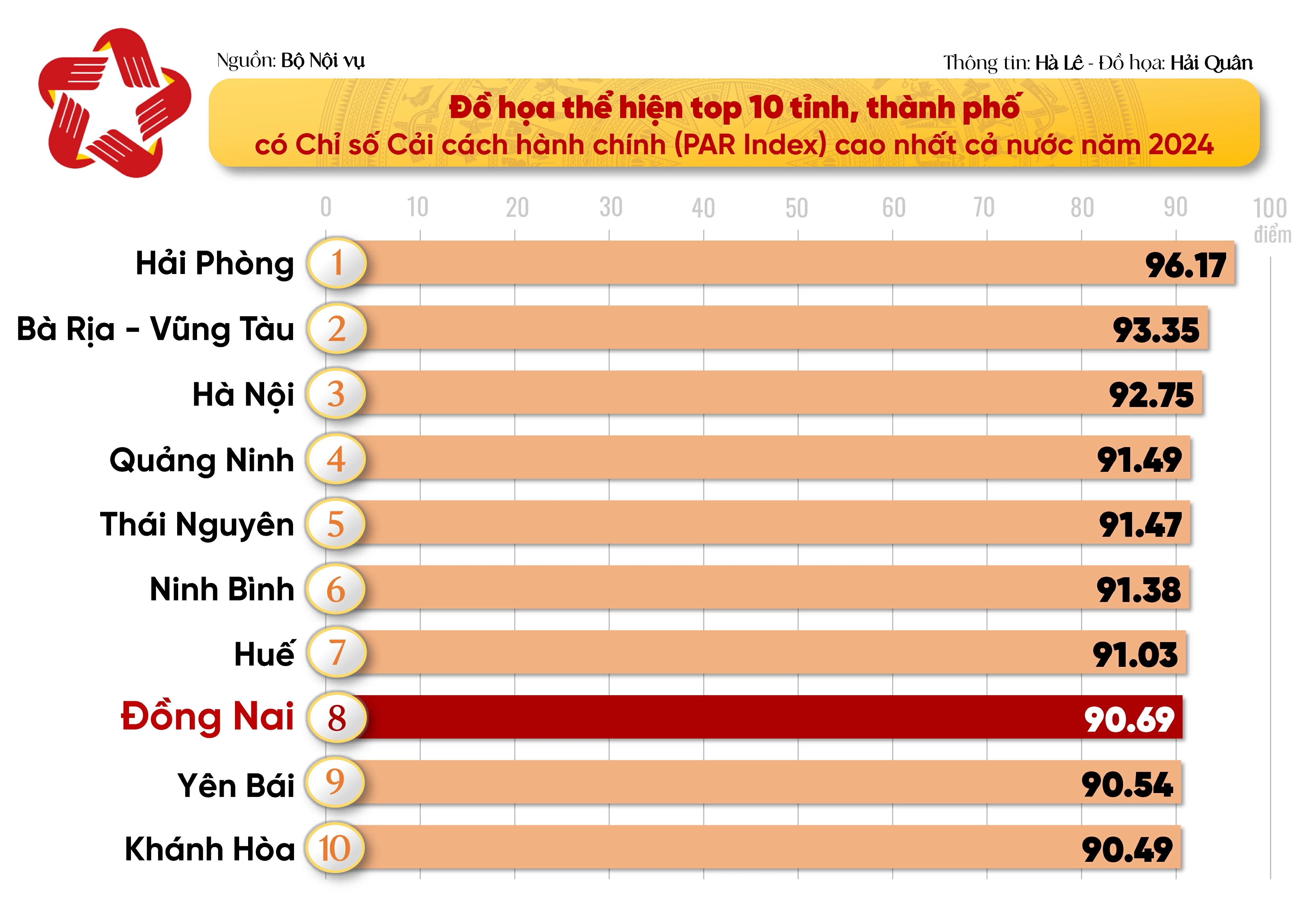 Những nỗ lực không ngừng nghỉ của cả hệ thống chính trị đã mang lại nhiều kết quả đáng khích lệ. Trong đó, sự bứt phá ngoạn mục của Chỉ số PAR Index năm 2024 là minh chứng rõ nét nhất. Từ vị trí 32, Đồng Nai đã vươn lên hạng 8/63 toàn quốc, đạt 90,69 điểm, tăng 24 bậc so với năm 2023.