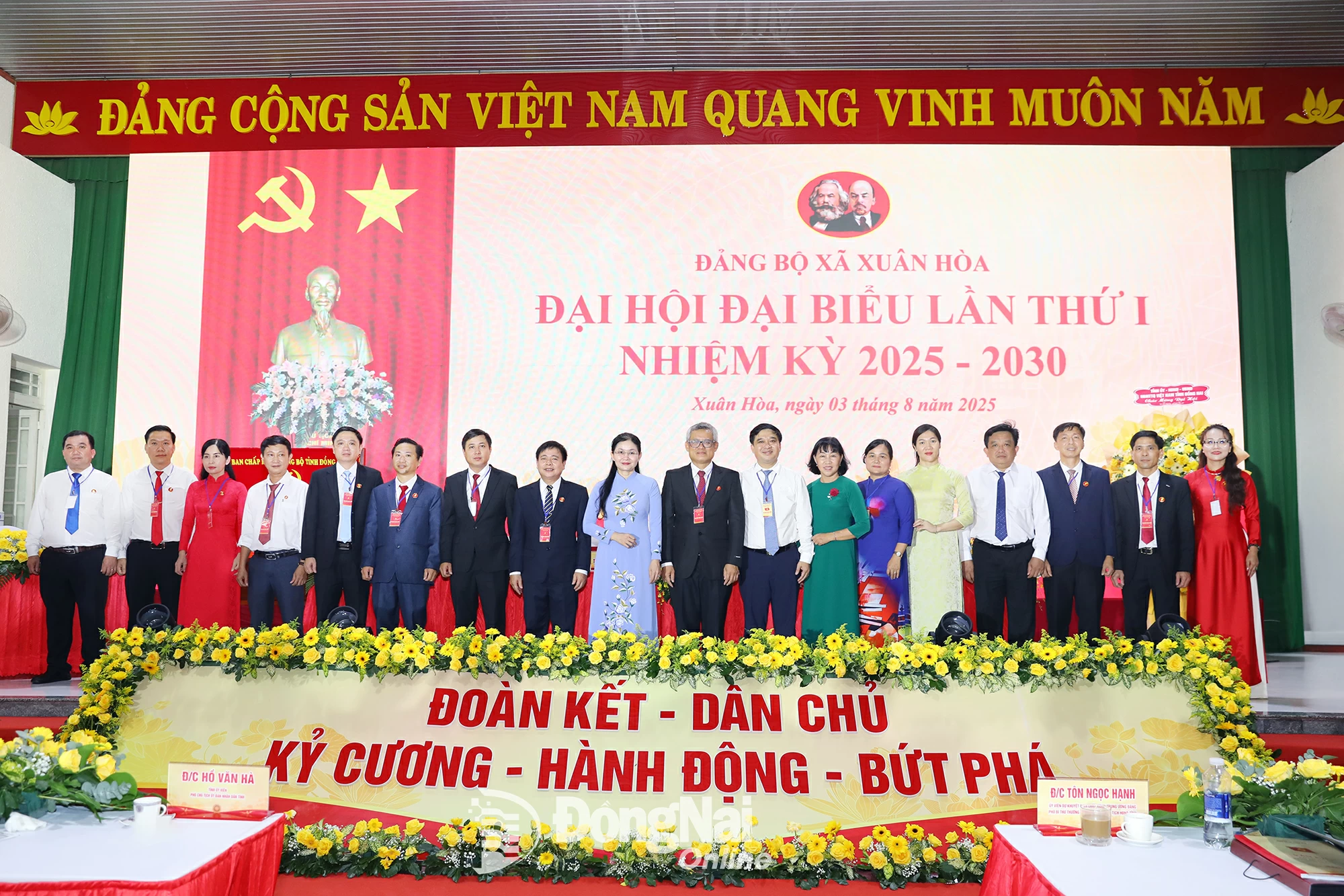 | Đồng chí Tôn Ngọc Hạnh, Ủy viên dự khuyết Trung ương Đảng, Phó Bí thư Thường trực Tỉnh ủy, Chủ tịch HĐND tỉnh Đồng Nai và Tỉnh ủy viên, Phó Chủ tịch UBND tỉnh Đồng Nai Hồ Văn Hà cùng các đại biểu chụp hình lưu niệm với Ban Chấp hành Đảng bộ xã Xuân Hòa khóa I, nhiệm kỳ 2025-2030. Ảnh: Huy Anh |