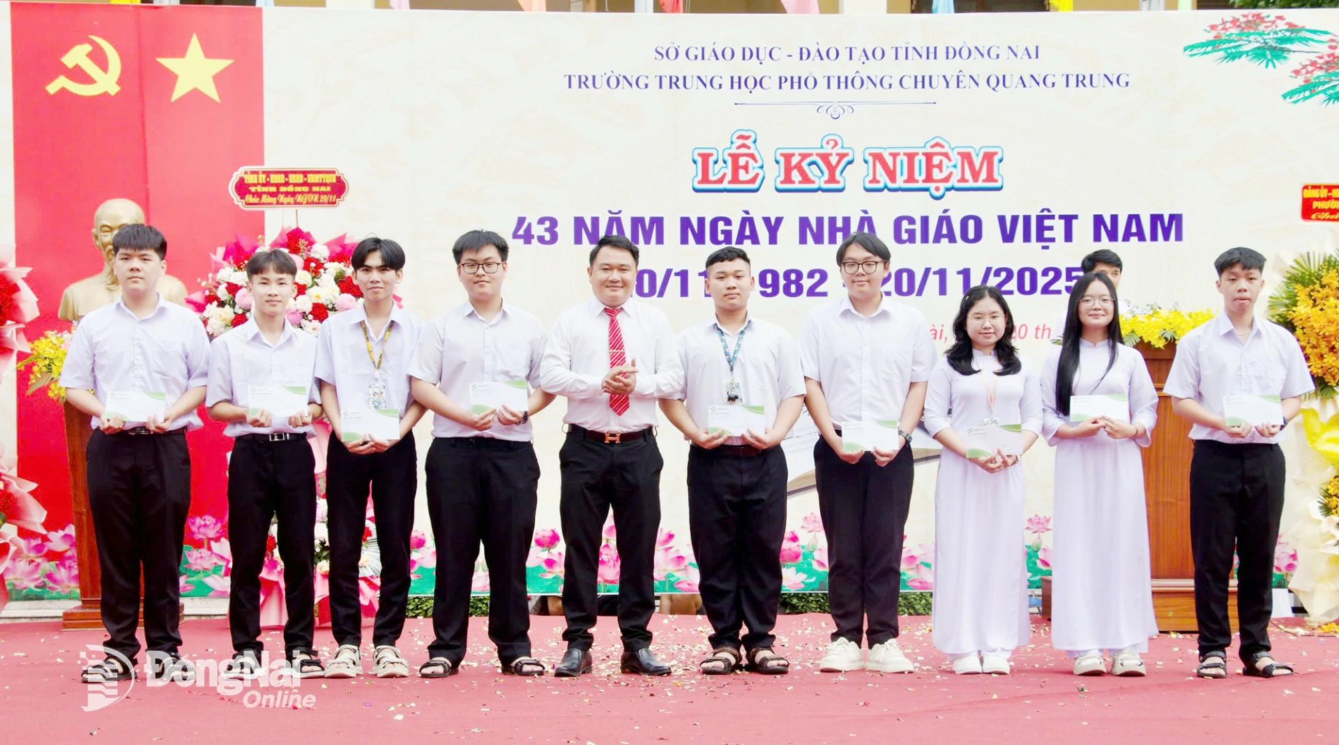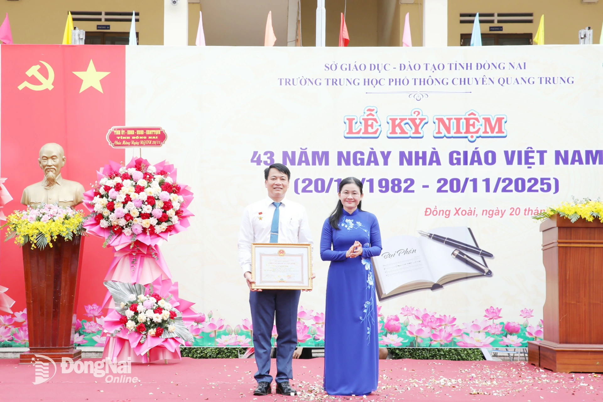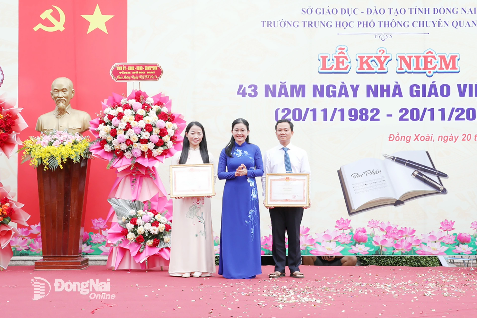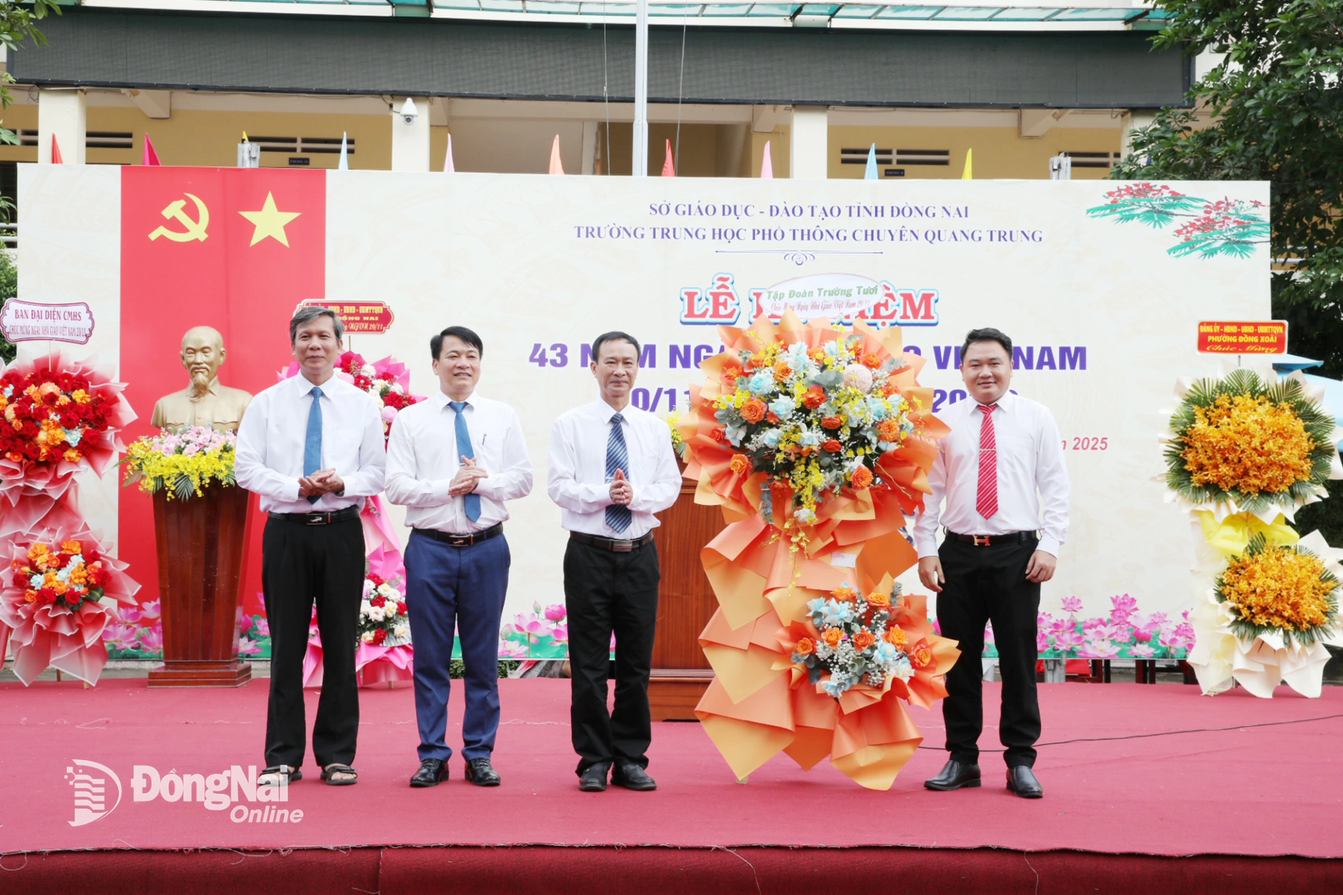 | Ủy viên dự khuyết Trung ương Đảng, Phó Bí thư Thường trực Tỉnh ủy, Chủ tịch HĐND tỉnh Đồng Nai Tôn Ngọc Hạnh trao lẵng hoa của Tỉnh ủy, HĐND, UBND, Ủy ban MTTQ Việt Nam tỉnh chúc mừng nhà trường dịp 20-11. Ảnh: Trương Hiện |