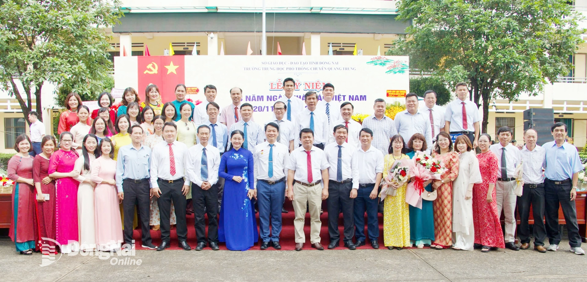 | Ủy viên dự khuyết Trung ương Đảng, Phó Bí thư Thường trực Tỉnh ủy, Chủ tịch HĐND tỉnh Đồng Nai Tôn Ngọc Hạnh; lãnh đạo các sở, ngành, địa phương, Ban Giám hiệu cùng tập thể sư phạm Trường THPT chuyên Quang Trung dự lễ. Ảnh: Trương Hiện |