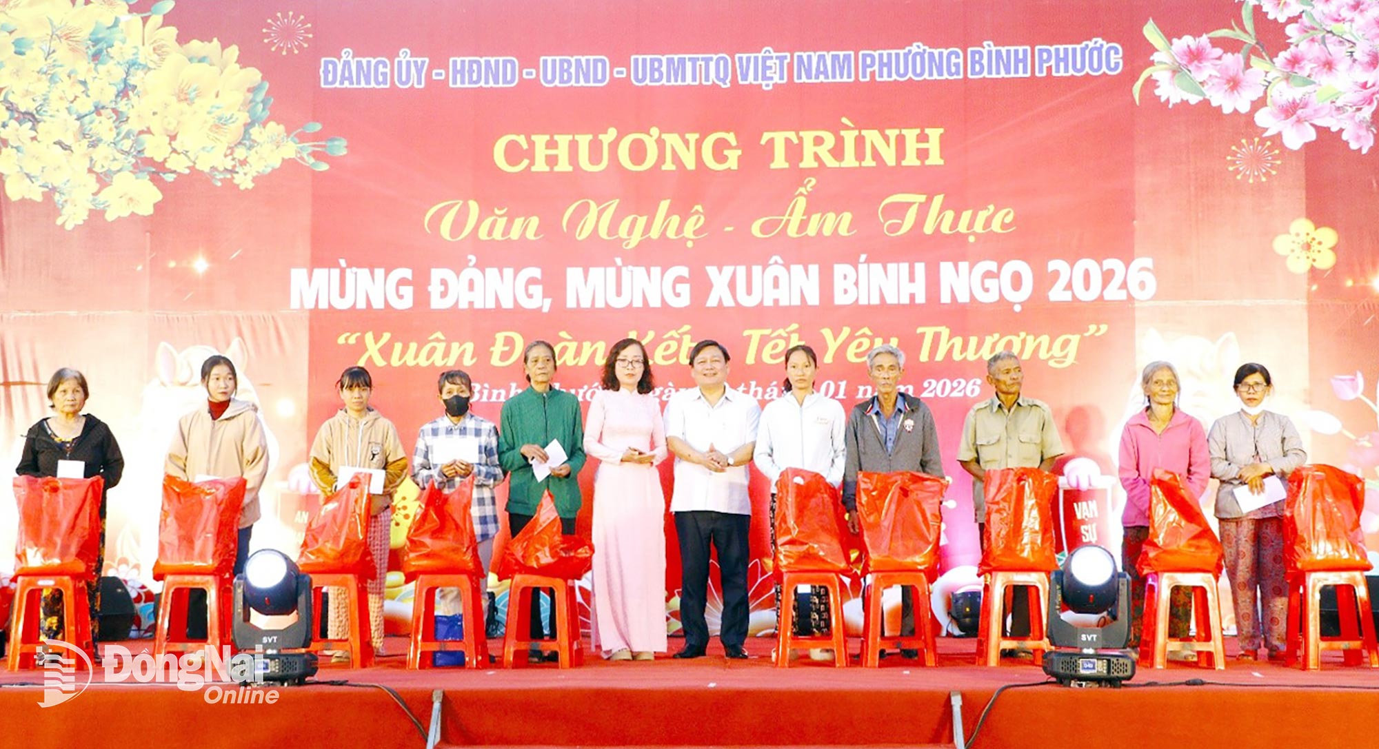 Để tạo không khí đón xuân ấm áp, yêu thương, người dân tham quan ẩm thực còn được thưởng thức chương trình văn nghệ mừng xuân 2026 do các câu lạc bộ, đội, nhóm văn nghệ cùng tham gia biểu diễn. Đồng thời, Ban tổ chức còn trao quà cho 20 hộ gia đình khó khăn trên địa bàn phường tại chương trình.