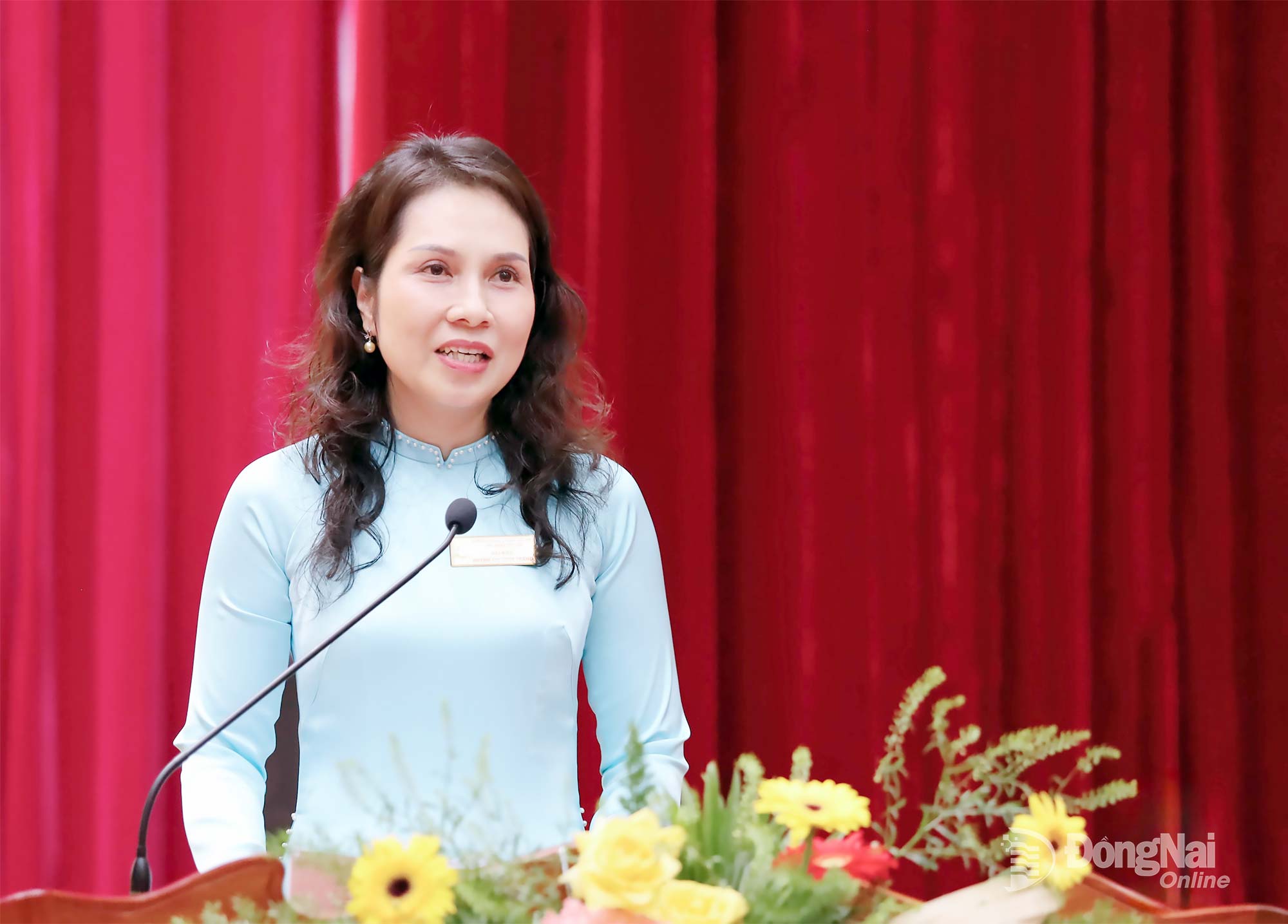 | Ủy viên Ban Thường vụ Tỉnh ủy, Trưởng Ban Nội chính Tỉnh ủy Đồng Nai Nguyễn Minh Hợi trao bức trướng của Ban Chấp hành Đảng bộ tỉnh tặng đại hội. Ảnh: Ngọc Thuận |