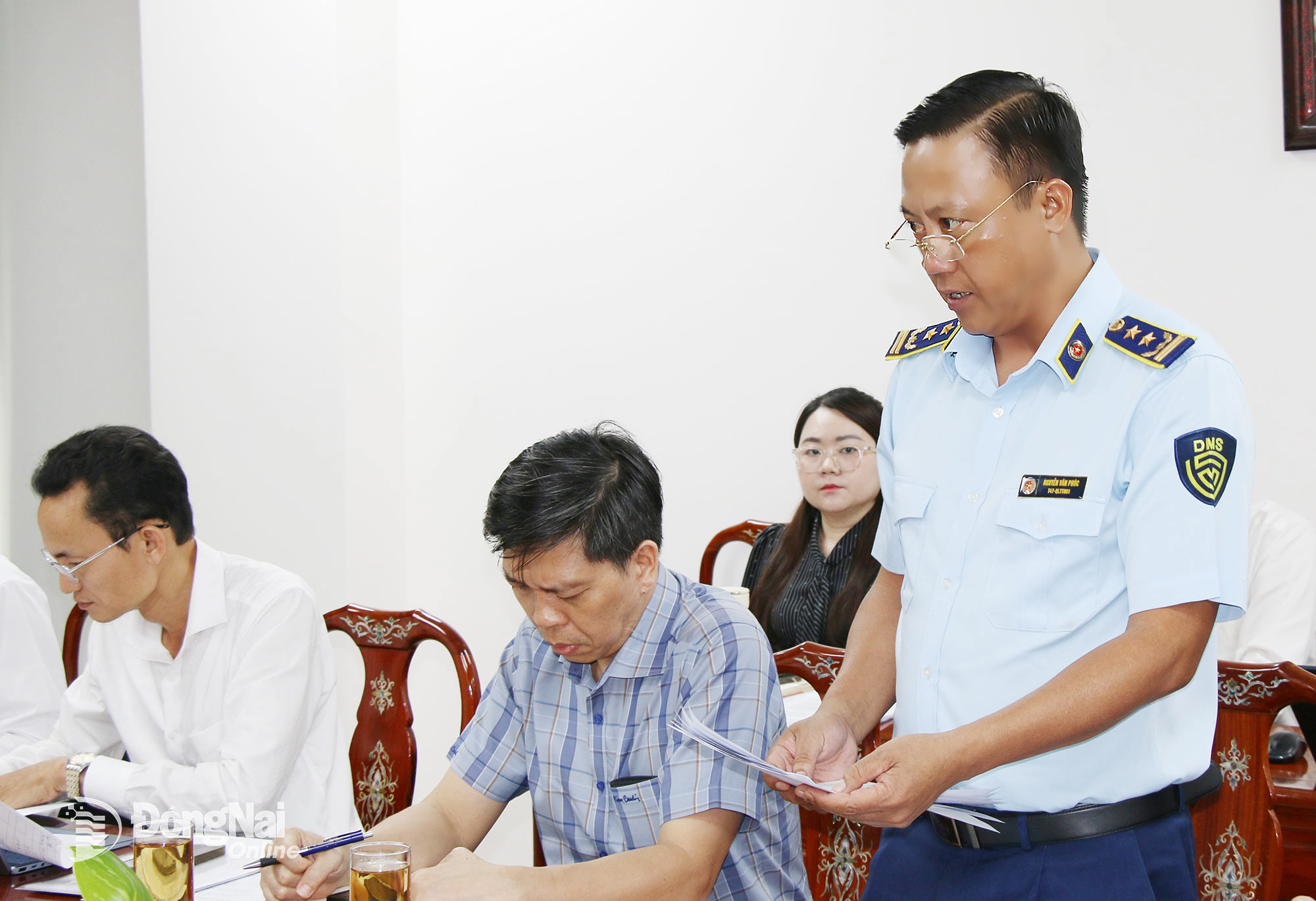 | Chi cục trưởng Chi cục Quản lý thị trường Đồng Nai (Sở Công Thương) Nguyễn Văn Phúc báo cáo tại cuộc họp. Ảnh: Hải Quân |
