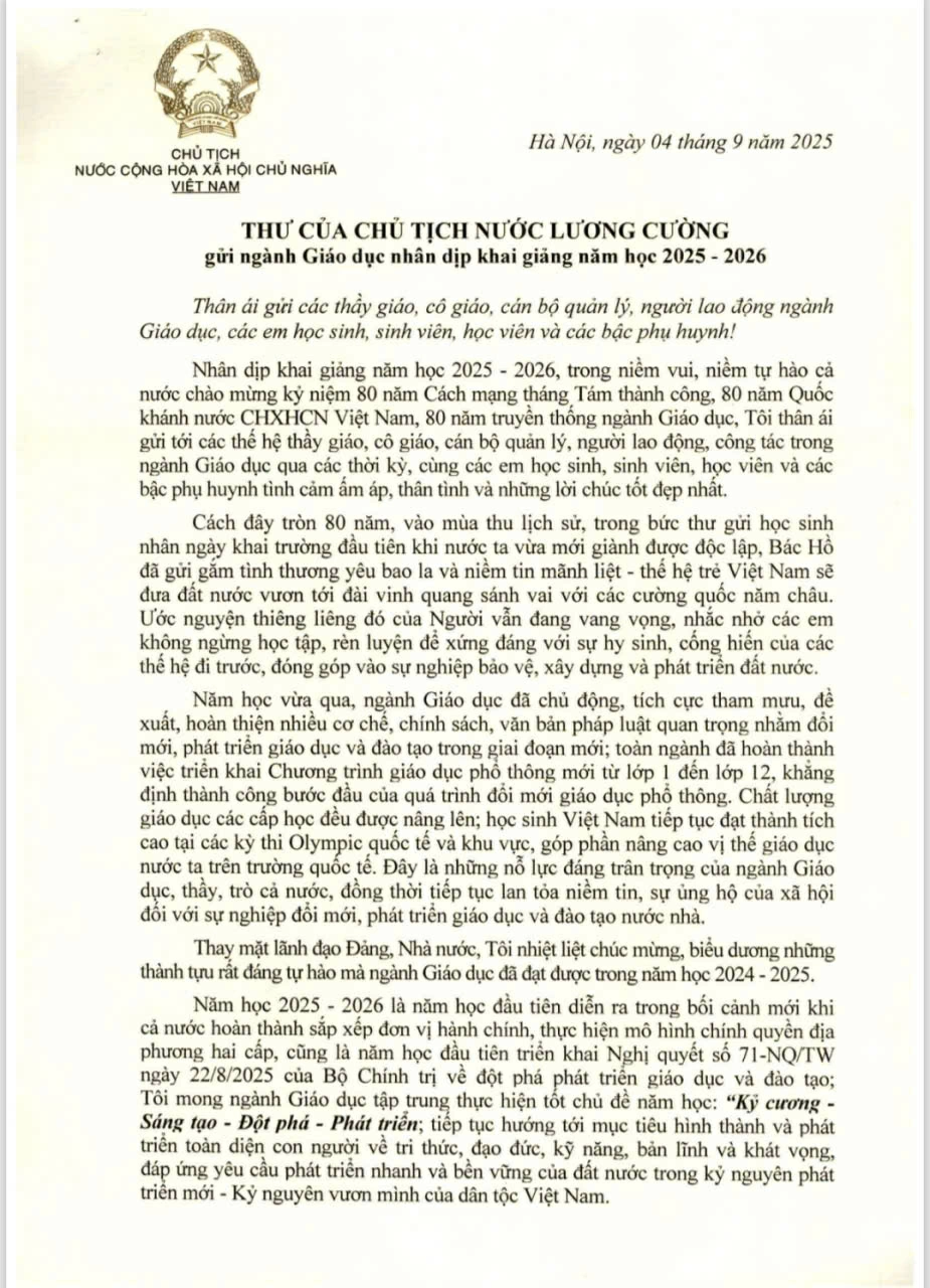 Thư của Chủ tịch nước Lương Cường gửi ngành Giáo dục nhân dịp khai giảng năm học 2025-2026