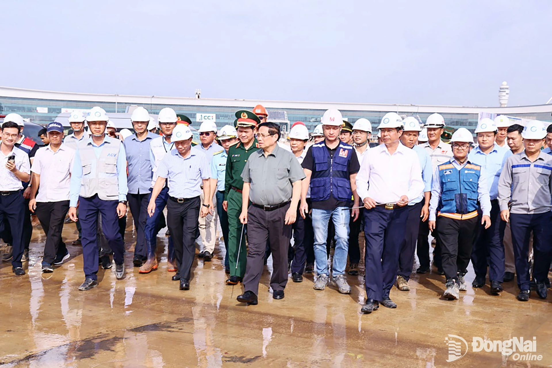 | Thủ tướng Chính phủ Phạm Minh Chính kiểm tra khu vực sân đỗ tàu bay Sân bay Long Thành. Ảnh: Công Nghĩa |