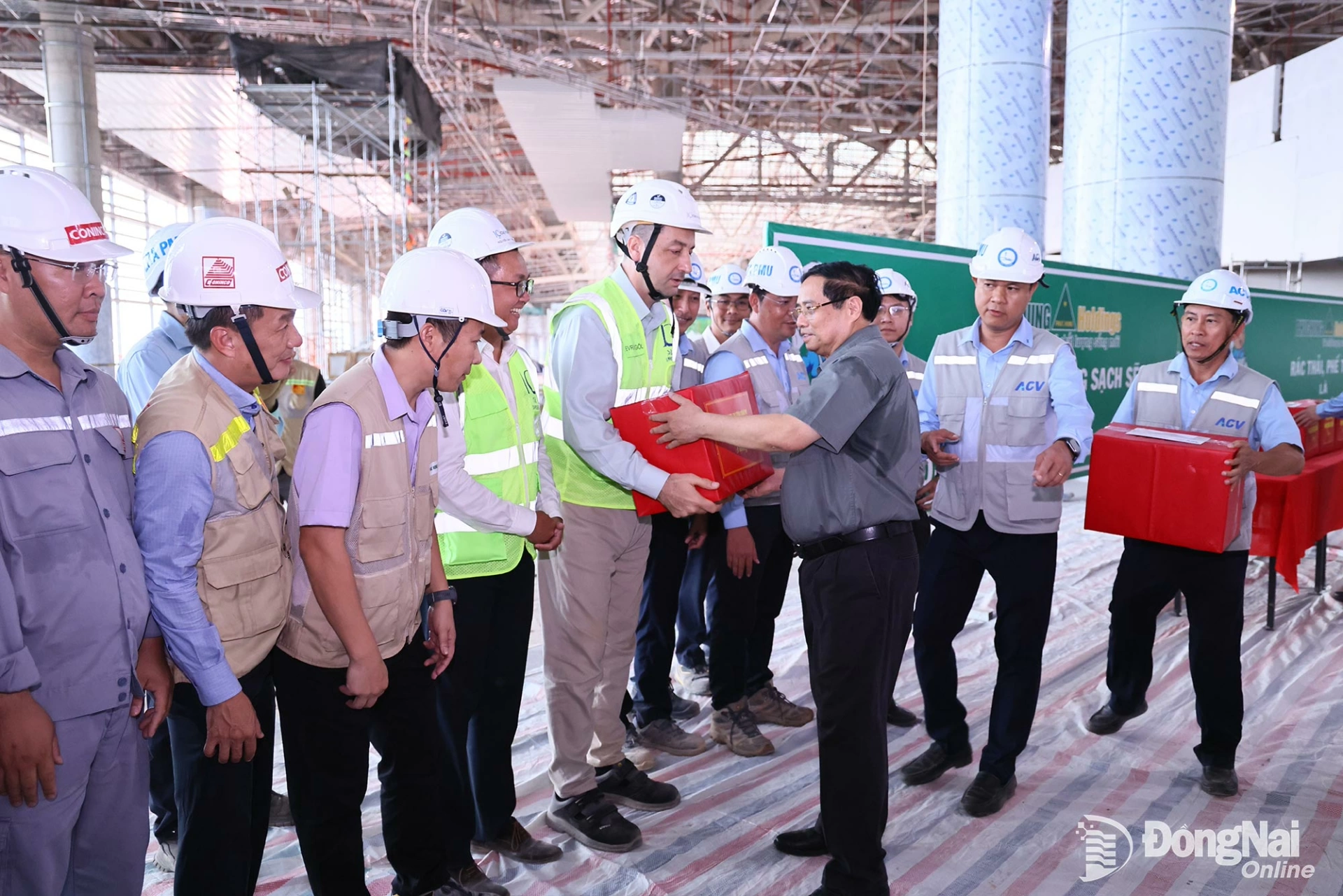 | Thủ tướng Chính phủ Phạm Minh Chính tặng quà động viên các lực lượng thi công dự án. Ảnh: Công Nghĩa |