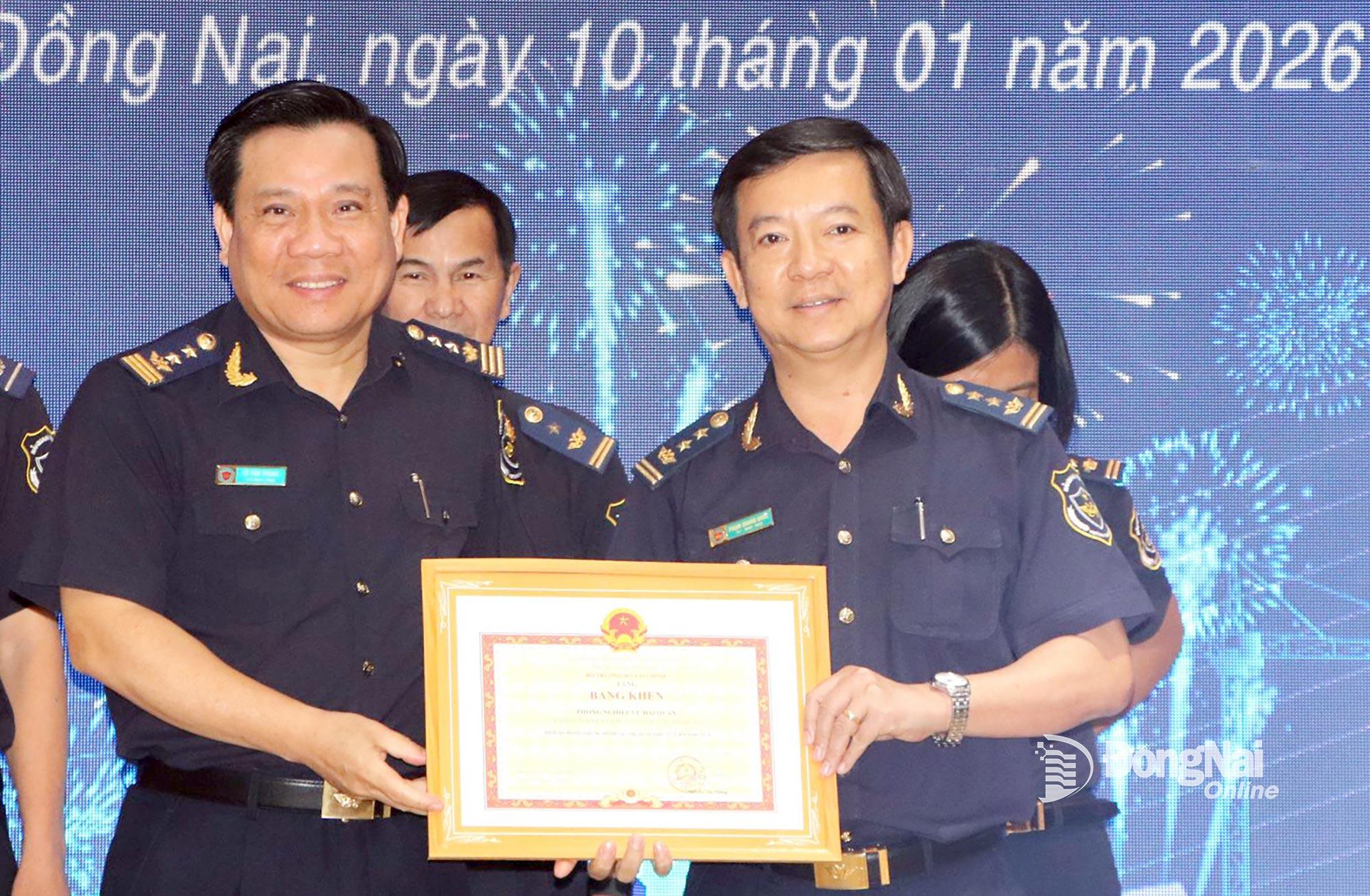 | Chi cục trưởng Chi cục Hải quan khu vực 18 Lê Văn Thung trao bằng khen của UBND tỉnh Đồng Nai cho các cá nhân hoàn thành xuất sắc nhiệm vụ. Ảnh: Ngọc Liên |