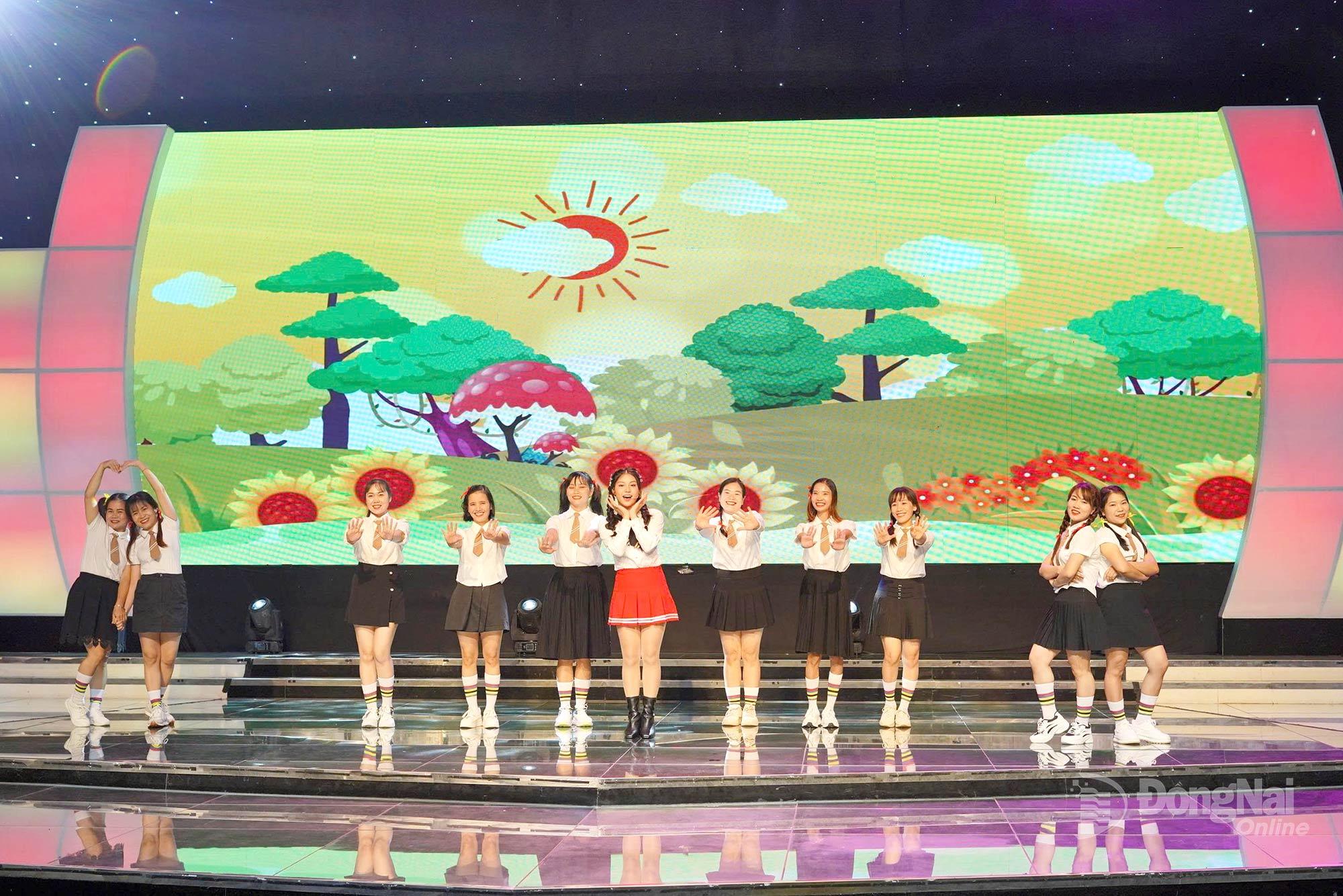 | Ca sĩ nhí Ái Khanh và Vũ đoàn Bầu Trời Xanh thể hiện ca khúc "Đón ánh mặt trời", sáng tác Trần Thanh Tùng, tại sân khấu Nhà hát Báo và Phát thanh, Truyền hình Đồng Nai. Ảnh: Phương Dung |