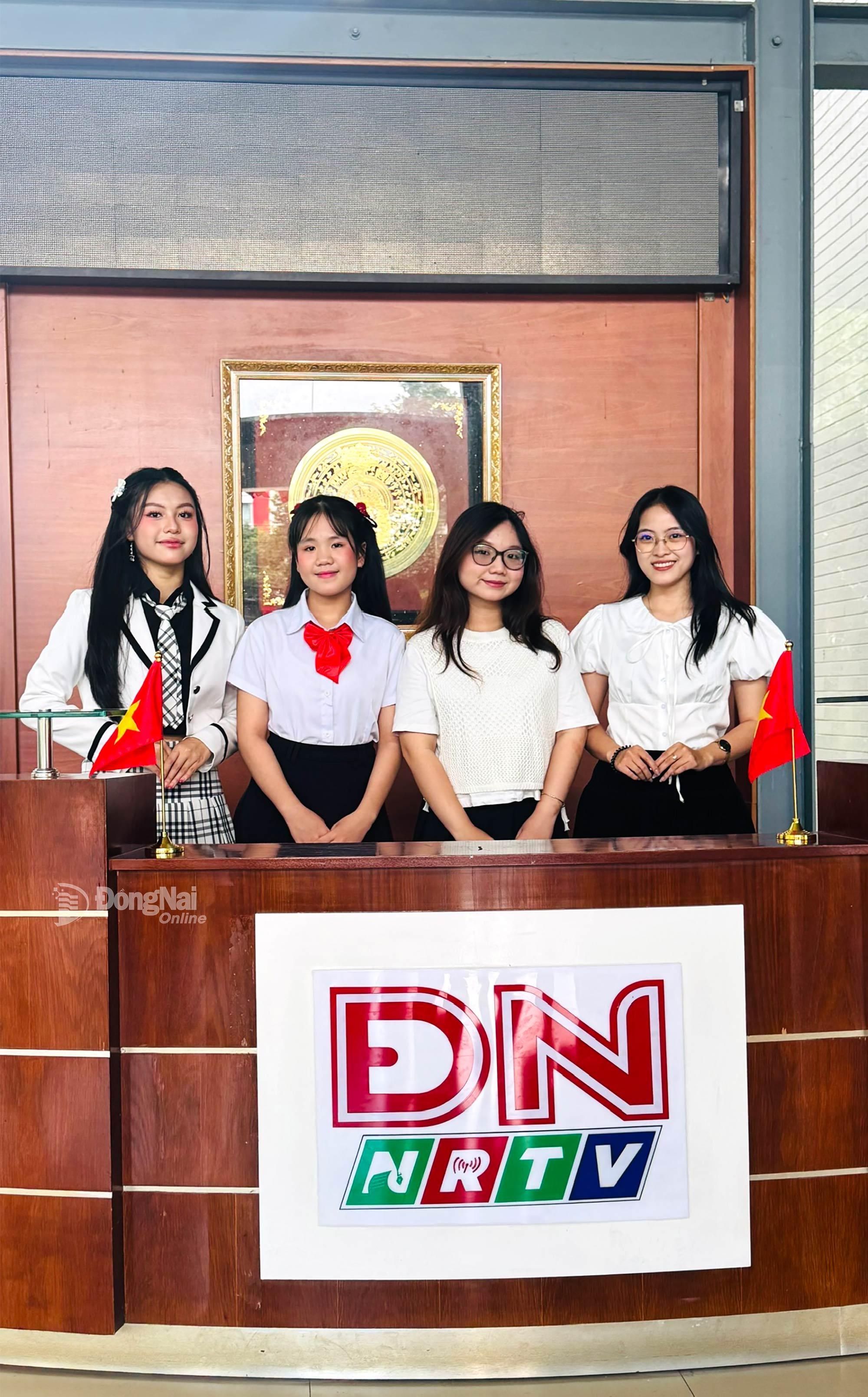 | Ca sĩ nhí Ái Khanh chụp hình với MC Quỳnh Anh, Trà My, Thư Kỳ tại Báo và Phát thanh, Truyền hình Đồng Nai. Ảnh: Minh Huệ |