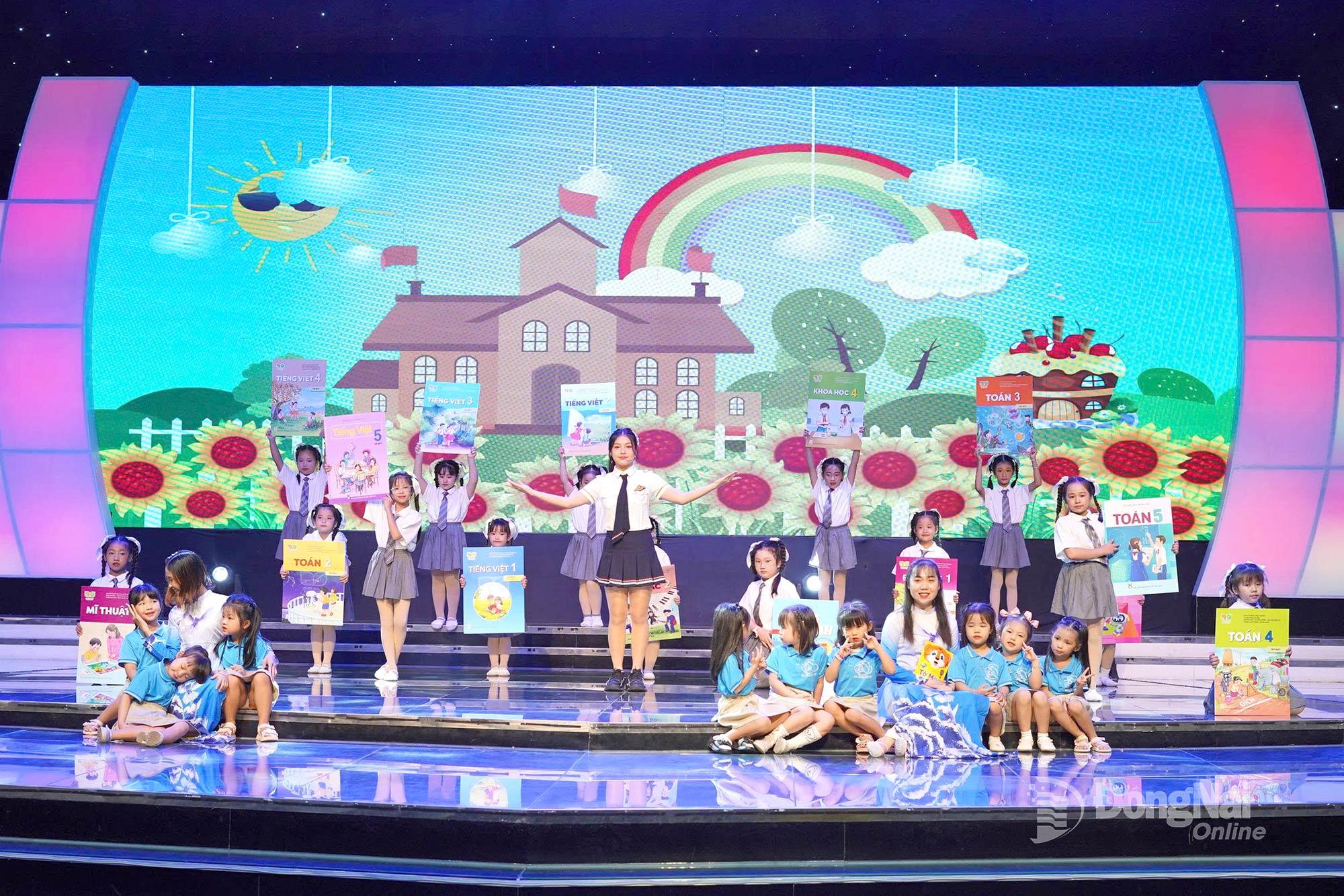 | Ca sĩ nhí Ái Khanh cùng Vũ đoàn Bầu Trời Xanh và Happy Kids thể hiện ca khúc "Vui đến trường", sáng tác Nguyễn Văn Chung tại sân khấu Nhà hát Báo và Phát thanh, Truyền hình Đồng Nai. Ảnh: Xuân Phú |