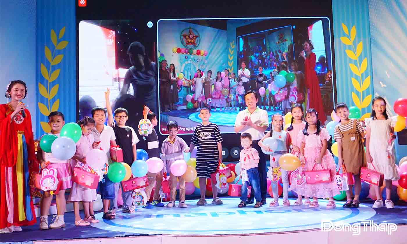 | Lãnh đạo cơ quan Báo và phát thanh, truyền hình Đồng Tháp trao quà cho con em cán bộ, viên chức, lao động của Báo và phát thanh, truyền hình Đồng Tháp tại phường Cao Lãnh. |