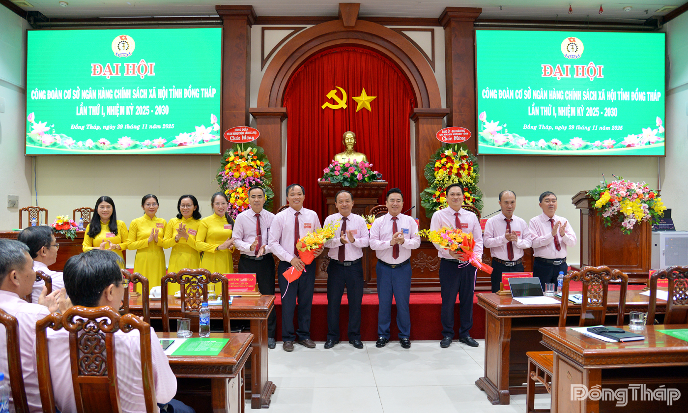 | Phó Tổng Giám đốc Ngân hàng Chính sách xã hội Huỳnh Văn Thuận và Giám đốc Chi nhánh Ngân hàng Chính sách xã hội tỉnh Đồng Tháp Dương Văn Hoàng tặng hoa chúc mừng Ban Chấp hành Công đoàn cơ sở Ngân hàng Chính sách xã hội tỉnh Đồng Tháp khóa I, nhiệm kỳ 2025 - 2030. |