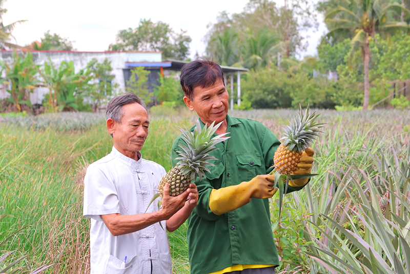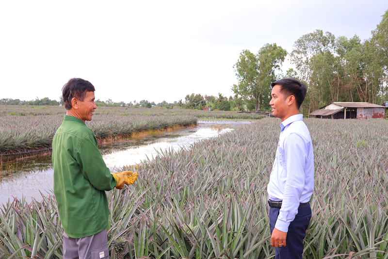 Lãnh đạo xã Tân Phước 3 (bên phải) khảo sát vùng chuyên canh khóm của địa phương, lắng nghe những đề xuất của nông dân về việc phát triển bền vững cho cây khóm