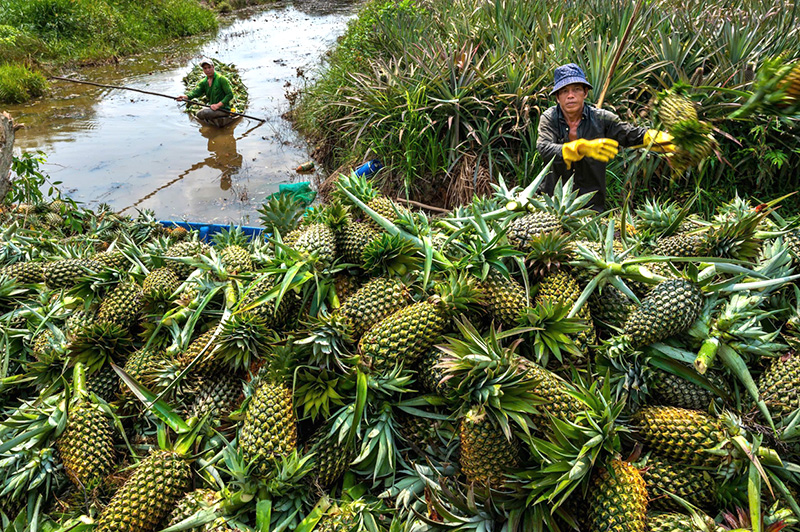 Thu hoạch khóm ở vùng chuyên canh khóm Tân Phước 3 (Ảnh: Duy Hải)