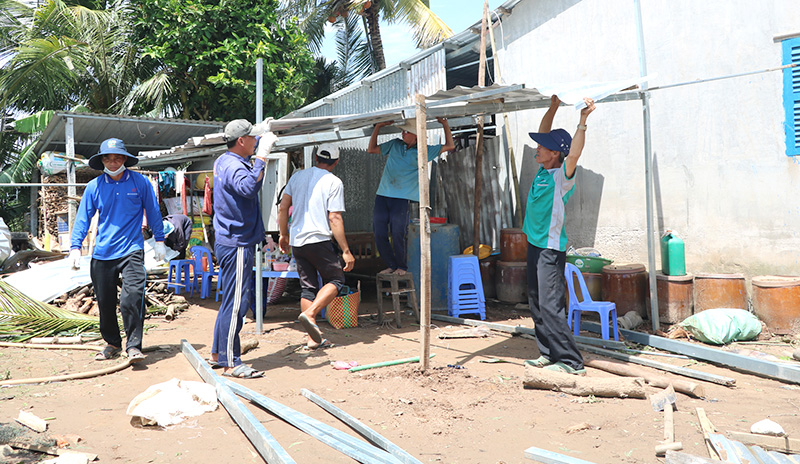 Người dân phường Mỹ Ngãi giúp nhau dựng nhà tạm cho hộ dân bị sập nhà do giông lốc