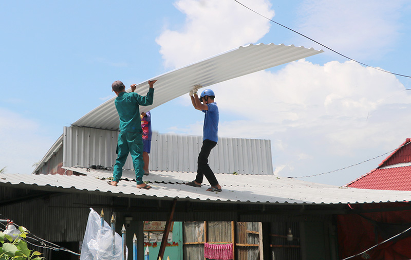 Lực lượng chức năng và người dân hỗ trợ lợp lại mái tôn cho người dân ở xã Ba Sao