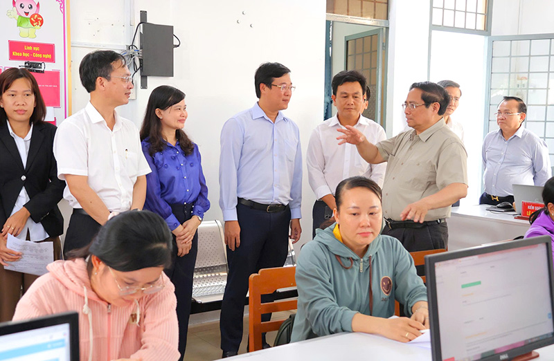 Thủ tướng Chính phủ Phạm Minh Chính thăm hỏi người dân về những thuận lợi và khó khăn khi đến thực hiện các thủ tục hành chính sau khi vận hành chính quyền 2 cấp tại xã Mỹ Hiệp