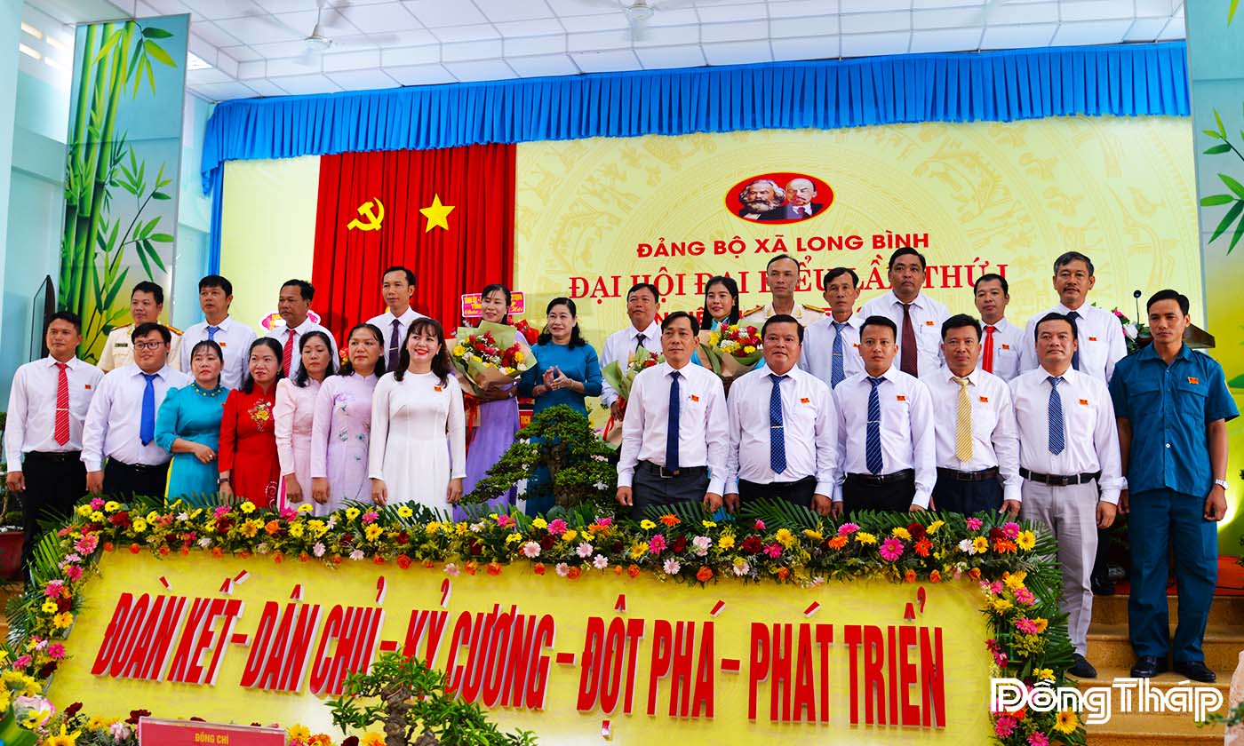 | Đồng chí Châu Thị Mỹ Phương, Phó Bí thư Tỉnh ủy, Chủ tịch Hội đồng nhân dân tỉnh Đồng Tháp tặng hoa chức mừng Ban Chấp hành Đảng bộ xã Long Bình nhiệm kỳ 2025 - 2030. |
