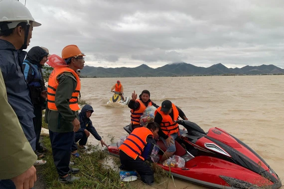 Tỉnh Gia Lai huy động lực lượng cứu trợ lương thực, nước uống cho người dân đang bị nước lũ cô lập. Ảnh: Hải Yến