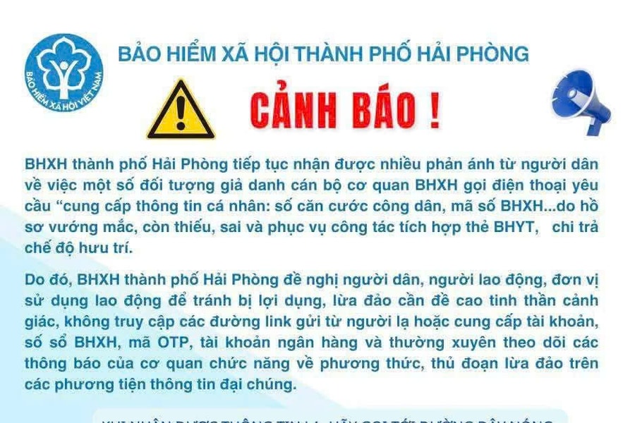 Bảo hiểm Xã hội thành phố Hải Phòng nhận được nhiều phản ánh từ người dân về việc một số đối tượng giả danh cán bộ cơ quan Bảo hiểm Xã hội thành phố gọi điện thoại yêu cầu cung cấp thông tin cá nhân như: số căn cước công dân, mã số bảo hiểm xã hội... do hồ sơ vướng mắc, còn thiếu, sai và phục vụ công tác tích hợp thẻ bảo hiểm y tế, chi trả chế độ hưu trí.