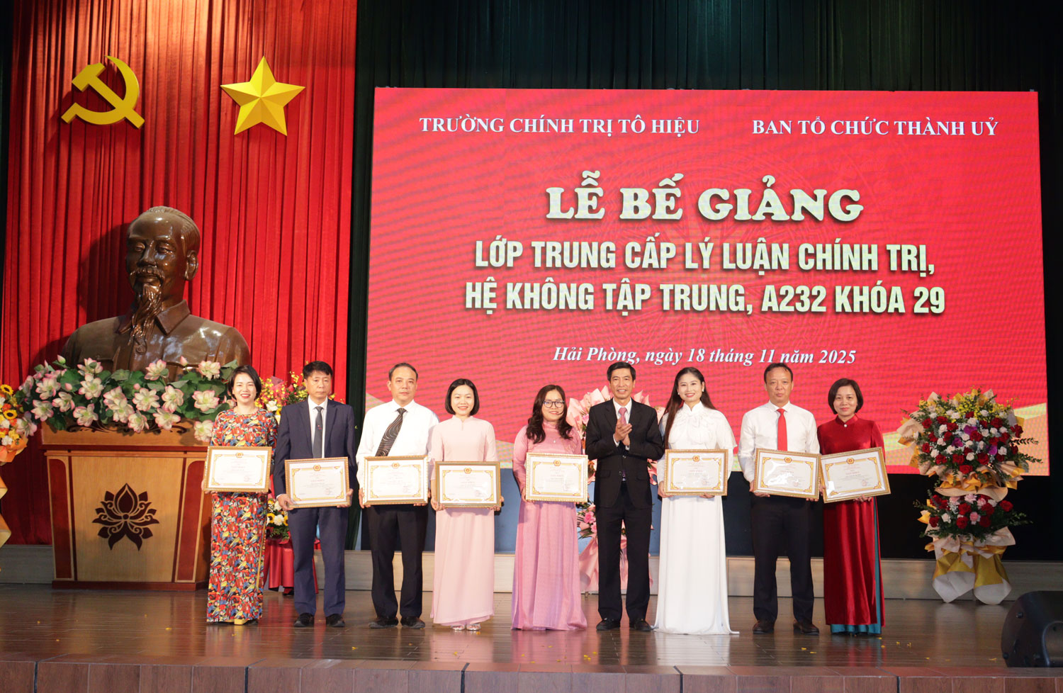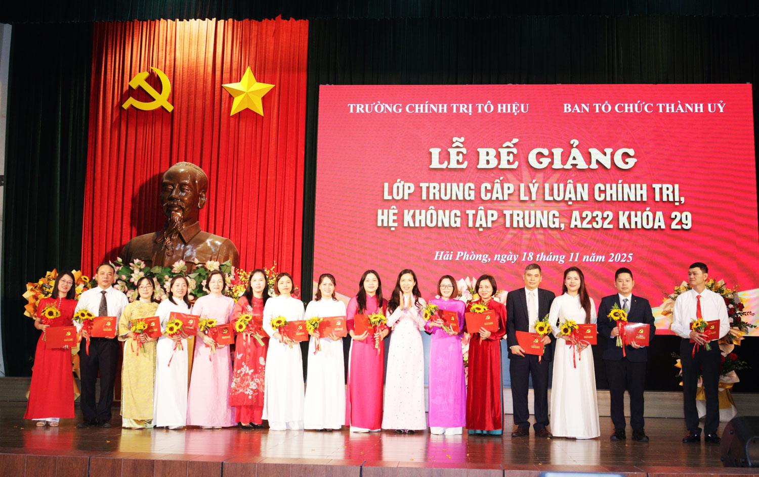 (Haiphong.gov.vn) - Chiều 18/11, Trường Chính trị Tô Hiệu phối hợp với Ban Tổ chức Thành ủy tổ chức Lễ bế giảng lớp Trung cấp lý luận chính trị, hệ không tập trung, A232 khóa 29, lớp học tổ chức tại cơ sở 2, phường Thành Đông. Dự Lễ bế giảng có đồng chí Nguyễn Văn Phú, Ủy viên Ban Thường vụ Thành ủy, Hiệu trưởng Trường Chính trị Tô Hiệu; Trương Đức San, Phó Trưởng Ban Tổ chức Thành ủy.