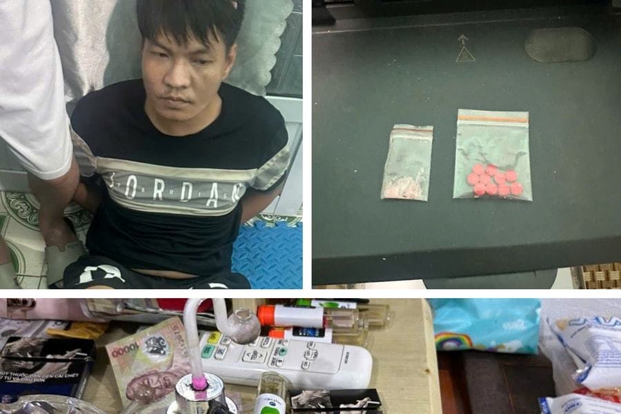 Tại chỗ ở của Đỗ Minh Thắng, lực lượng Công an khám xét, thu giữ thêm 10 viên nén màu hồng, 1 túi nilon chứa chất tinh thể màu trắng - hồng, 1 chai nhựa.