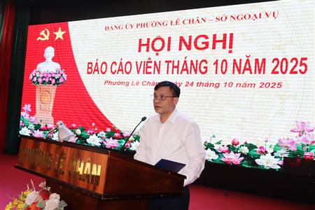(Haiphong.gov.vn) - Chiều 24/10, Đảng ủy phường Lê Chân phối hợp với Sở Ngoại vụ tổ chức Hội nghị báo cáo viên tháng 10/2025 thông tin đối ngoại chuyên đề “Tình hình thế giới và khu vực 10 tháng đầu năm 2025; một số hoạt động đối ngoại lớn của lãnh đạo Đảng và Nhà nước”.