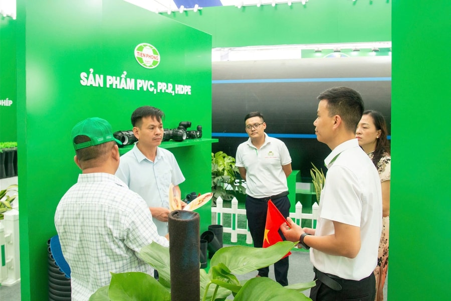 Nổi bật trong đó, gian hàng của Công ty CP Nhựa Thiếu niên Tiền Phong giới thiệu các dòng sản phẩm chủ lực như ống PVC, HDPE, PP-R đạt chứng nhận xanh quốc tế, cùng nhiều sản phẩm tiên phong lần đầu có tại Việt Nam như ống HDPE cỡ lớn DN 2000mm, ống PP gân sóng 2 lớp, hộp kiểm soát kỹ thuật PVC-U. Doanh nghiệp còn trưng bày các mô hình mô phỏng giải pháp thi công đồng bộ, từ hệ thống lắp đặt ống chống cháy CPVC đạt chuẩn quốc tế đến mô-đun nhựa chôn ngầm tích trữ nước sạch, giải pháp chống ngập úng và hạn hán…