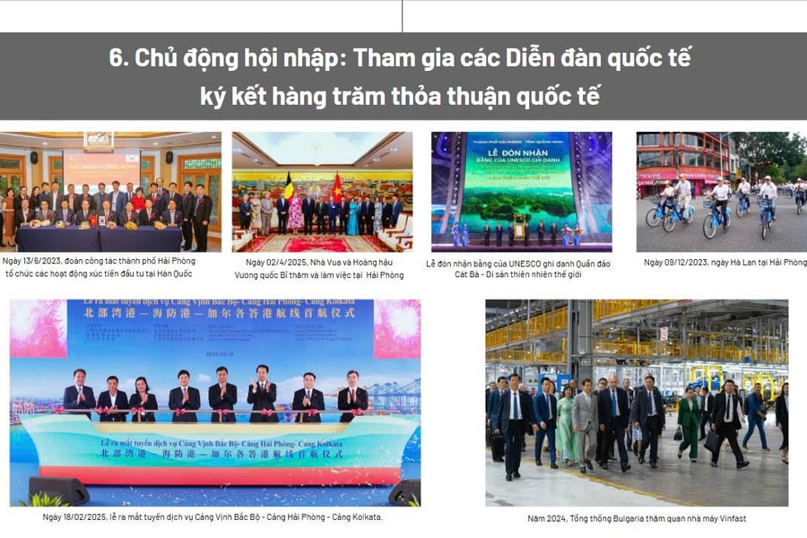 Trong khuôn khổ Triển lãm thành tựu đất nước, đóng góp vào nội dung những thành tựu về kinh tế - văn hóa - xã hội- đối ngoại - an ninh quốc phòng của Hải Phòng các giai đoạn từ 1945 - 1955, 1955 - 1986 và 1986 - 2025 là những hình ảnh tư liệu quý, tiêu biểu, thể hiện các dấu ấn nổi bật trong công tác đối ngoại của thành phố.