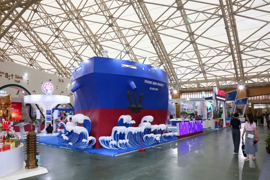 Con tàu lướt sóng mang khát vọng phát triển hướng ra biển lớn là hình ảnh chủ đạo tại khu trưng bày trong nhà của thành phố Hải Phòng
