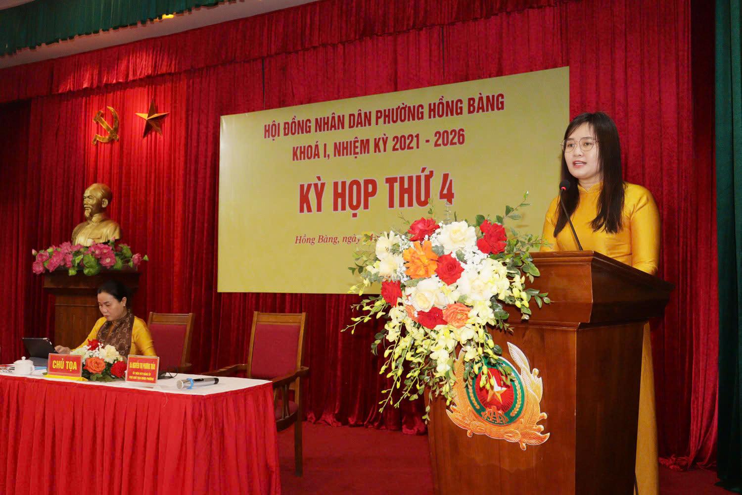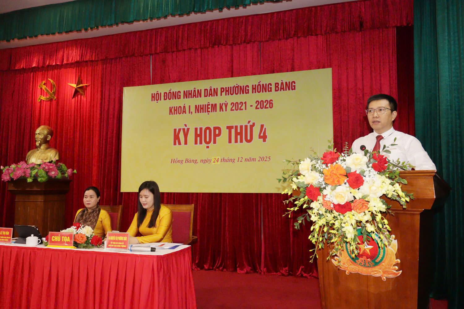 Tại kỳ họp, các đại biểu HĐND phường đã nghe và thảo luận nhiều báo cáo quan trọng, gồm: Báo cáo hoạt động của Thường trực HĐND, các Ban HĐND; báo cáo của Thường trực HĐND phường tổng hợp các ý kiến kiến nghị của cử tri tham gia vào nội dung Kỳ họp thứ 4 của HĐND phường; Kế hoạch Phát triển kinh tế - xã hội, quốc phòng - an ninh phường Hồng Bàng 5 năm 2026 - 2030; nhiệm vụ giải pháp phát triển kinh tế - xã hội, quốc phòng - an ninh phường năm 2026; Dự toán và phân bổ ngân sách phường năm 2026; Kế hoạch đầu tư công trung hạn phường Hồng Bàng giai đoạn 2026 - 2030; Kế hoạch đầu tư công phường Hồng Bàng năm 2026; Kế hoạch thu các loại quỹ vận động trên địa bàn phường năm 2026; Giao biên chế số lượng người làm việc, hợp đồng lao động hưởng lương từ ngân sách nhà nước trong cơ quan, đơn vị thuộc HĐND, UBND phường năm 2026...