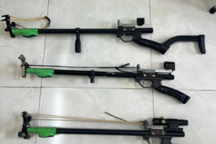 Người dân đã giao nộp 3 khẩu súng tự chế, dạng súng ná sử dụng lực kéo bằng dây cao su để bắn tên, gạch, đá hoặc kim loại. Các khẩu súng này dài từ 80 - 100 cm, thân hình trụ, gắn ống ngắm, báng kim loại, tiềm ẩn nguy cơ gây thương tích cao nếu bị sử dụng sai mục đích.