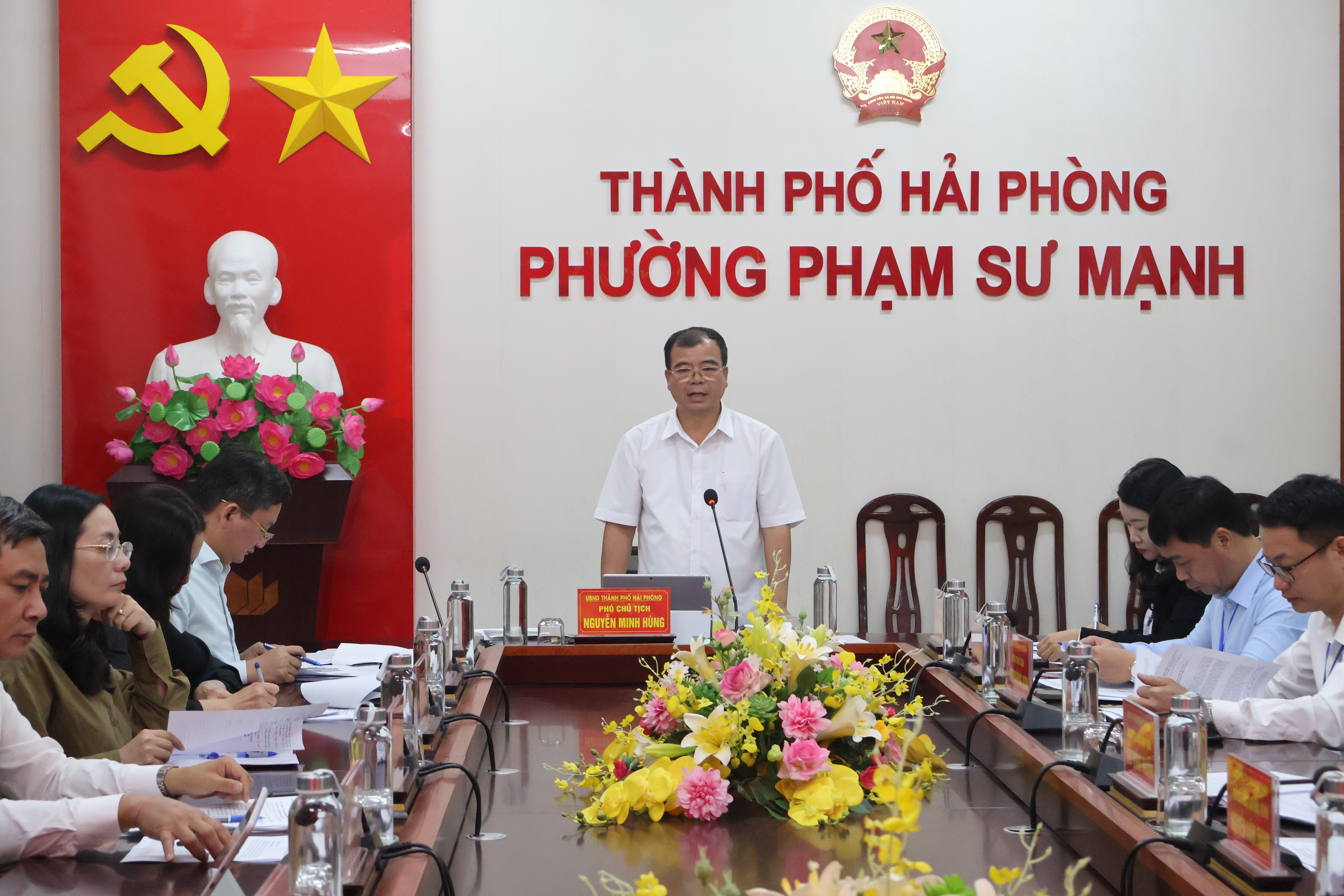 Phó Chủ tịch UBND thành phố Nguyễn Minh Hùng phát biểu tại buổi làm việc với lãnh đạo phường Phạm Sư Mạnh.