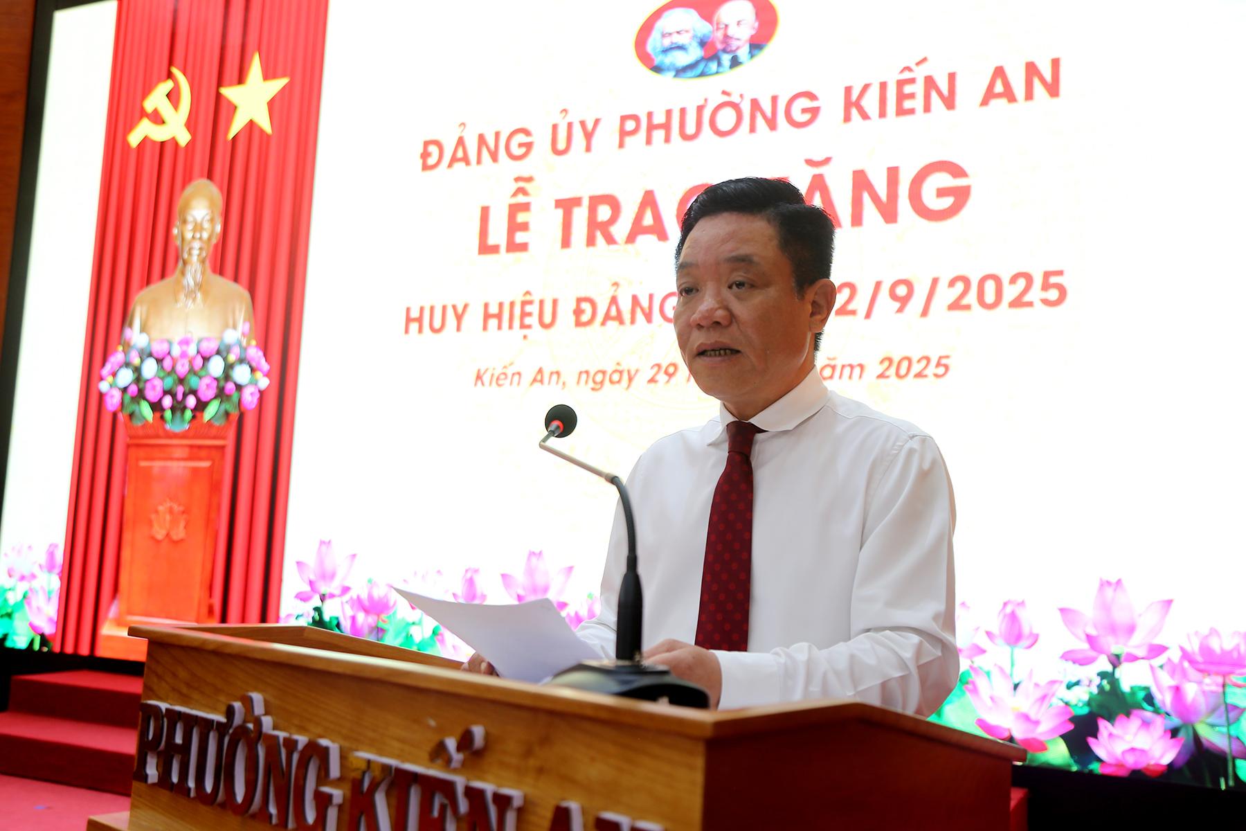 Phát biểu tại buổi Lễ, Bí thư Đảng ủy, Chủ tịch HĐND phường Trần Quang Tuấn chúc mừng các đảng viên được trao tặng Huy hiệu Đảng đợt 2/9/2025. Đồng chí khẳng định, các đảng viên được vinh danh đợt này cùng với các thế hệ đi trước là những tấm gương sáng, đã cống hiến trí tuệ, công sức cho sự nghiệp xây dựng, bảo vệ Tổ quốc, đồng thời góp phần xây dựng tổ chức Đảng ngày càng trong sạch, vững mạnh, đóng góp vào sự phát triển của phường Kiến An, thành phố Hải Phòng và đất nước.