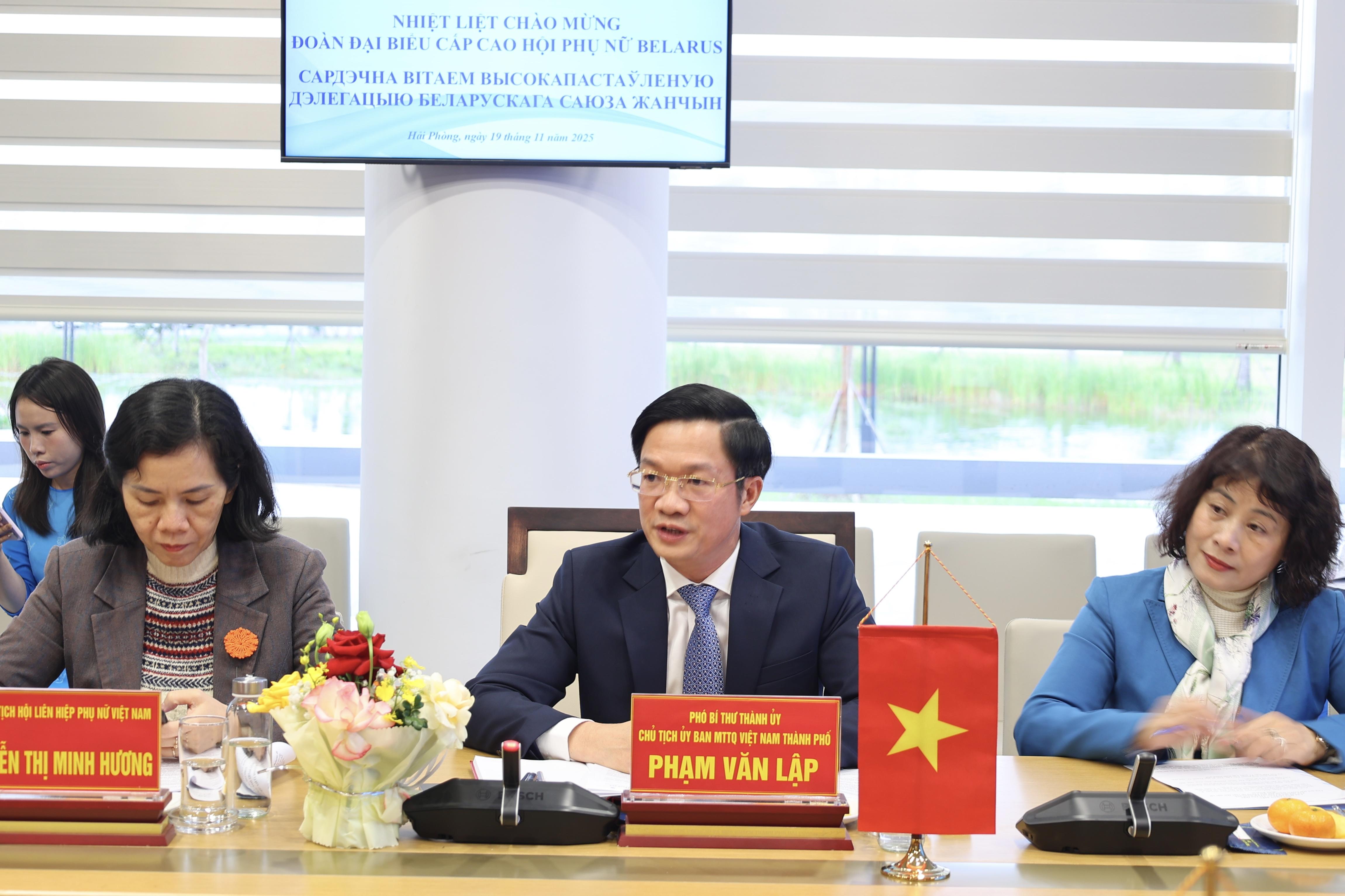 Phát biểu tại buổi làm việc, đồng chí Phó Bí thư Thành ủy, Chủ tịch Ủy ban MTTQ Việt Nam thành phố Phạm Văn Lập bày tỏ vui mừng được đón tiếp Đoàn; đồng thời giới thiệu khái quát về những thành tựu nổi bật của Hải Phòng trong thời gian qua và nhấn mạnh vai trò của phụ nữ trong công cuộc phát triển chung của thành phố.