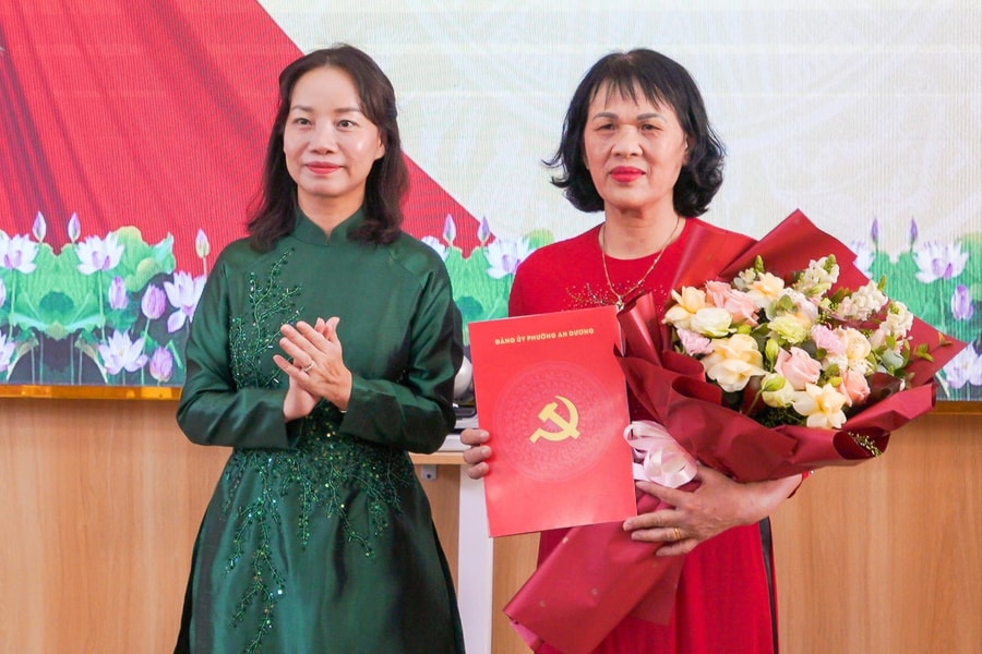 Lãnh đạo Đảng ủy phường An Dương trao hoa và quyết định thành lập Chi bộ Hợp tác xã Dịch vụ nông nghiệp Lê Lợi.