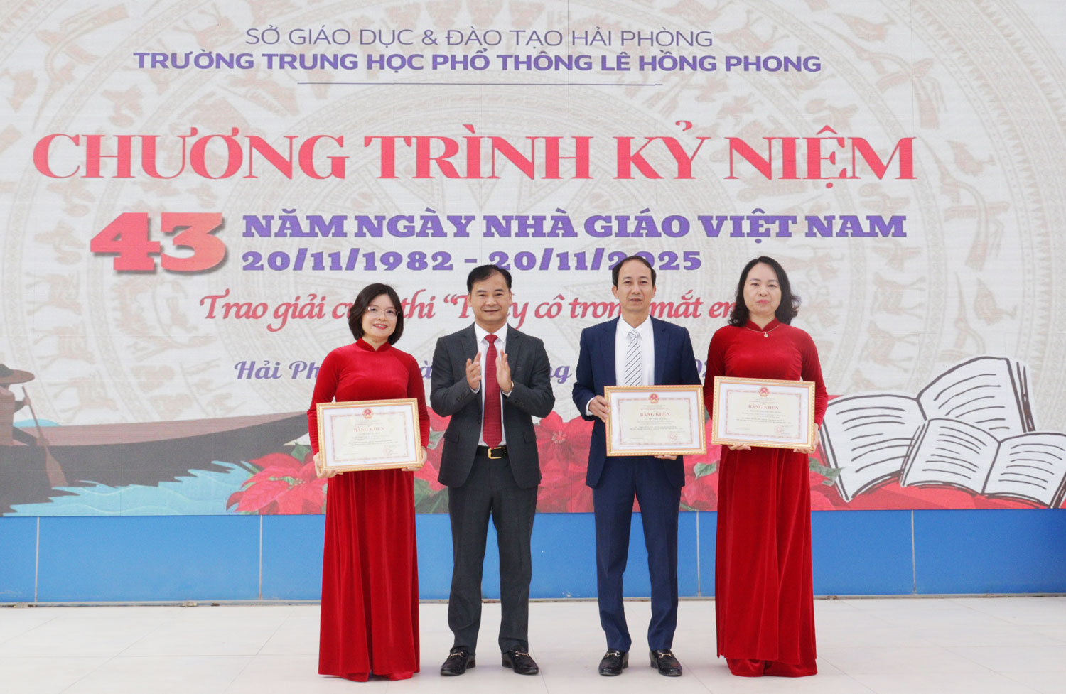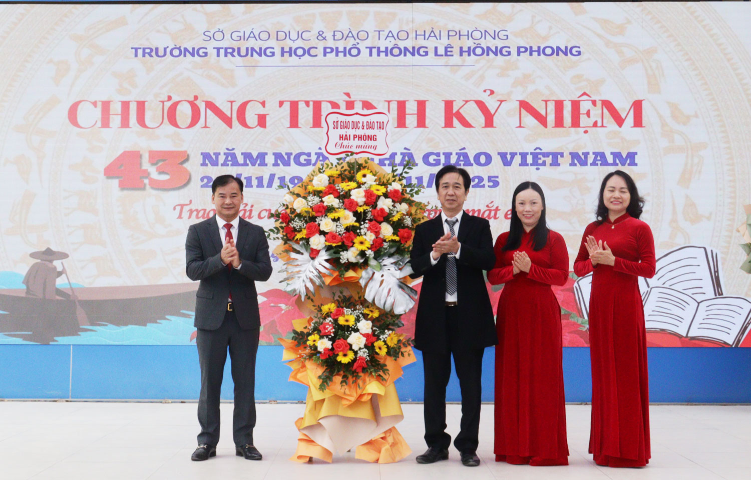 (Haiphong.gov.vn) - Sáng 20/11, Trường THPT Lê Hồng Phong (phường Hồng Bàng) tổ chức kỷ niệm 43 năm Ngày Nhà giáo Việt Nam (20/11/1982 - 20/11/2025) và biểu dương giáo viên đạt thành tích cao năm học 2024 - 2025. Tới dự có các đồng chí: Phạm Hồng Quân, Phó Giám đốc Sở Giáo dục và Đào tạo; Lê Thị Vân, Phó Bí thư Thường trực Đảng ủy, Chủ tịch HĐND phường Hồng Bàng.