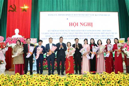 (Haiphong.gov.vn) - Sáng 19/11, UBND xã Vĩnh tổ chức Hội nghị gặp mặt kỷ niệm 43 năm Ngày Nhà giáo Việt Nam (20/11/1982 – 20/11/2025) và đón nhận Bằng công nhận Trường Mầm non Giang Biên đạt chuẩn Quốc gia mức độ 2, kiểm định chất lượng giáo dục cấp độ 3; đồng thời biểu dương các giáo viên và học sinh có thành tích xuất sắc trong năm học 2024 – 2025.