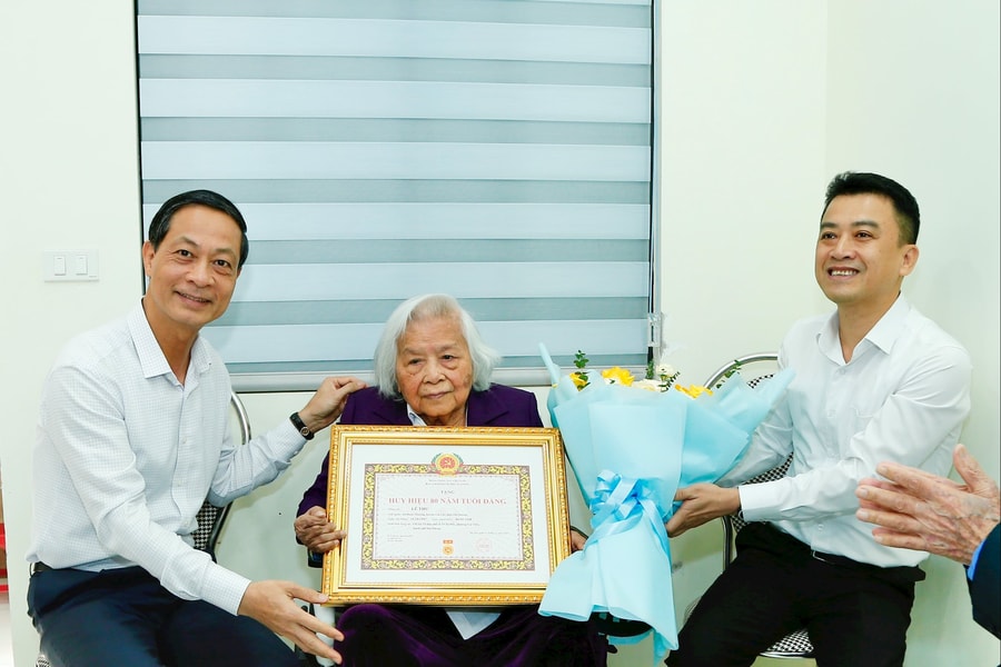 Đồng chí Đỗ Mạnh Hiến, Phó bí thư Thường trực Thành ủy trao tặng huy hiệu 80 năm tuổi Đảng tại gia đình cho đồng chí Lê Thu, Đảng viên Chi bộ Tổ dân phố số 4 Cầu Đất.
