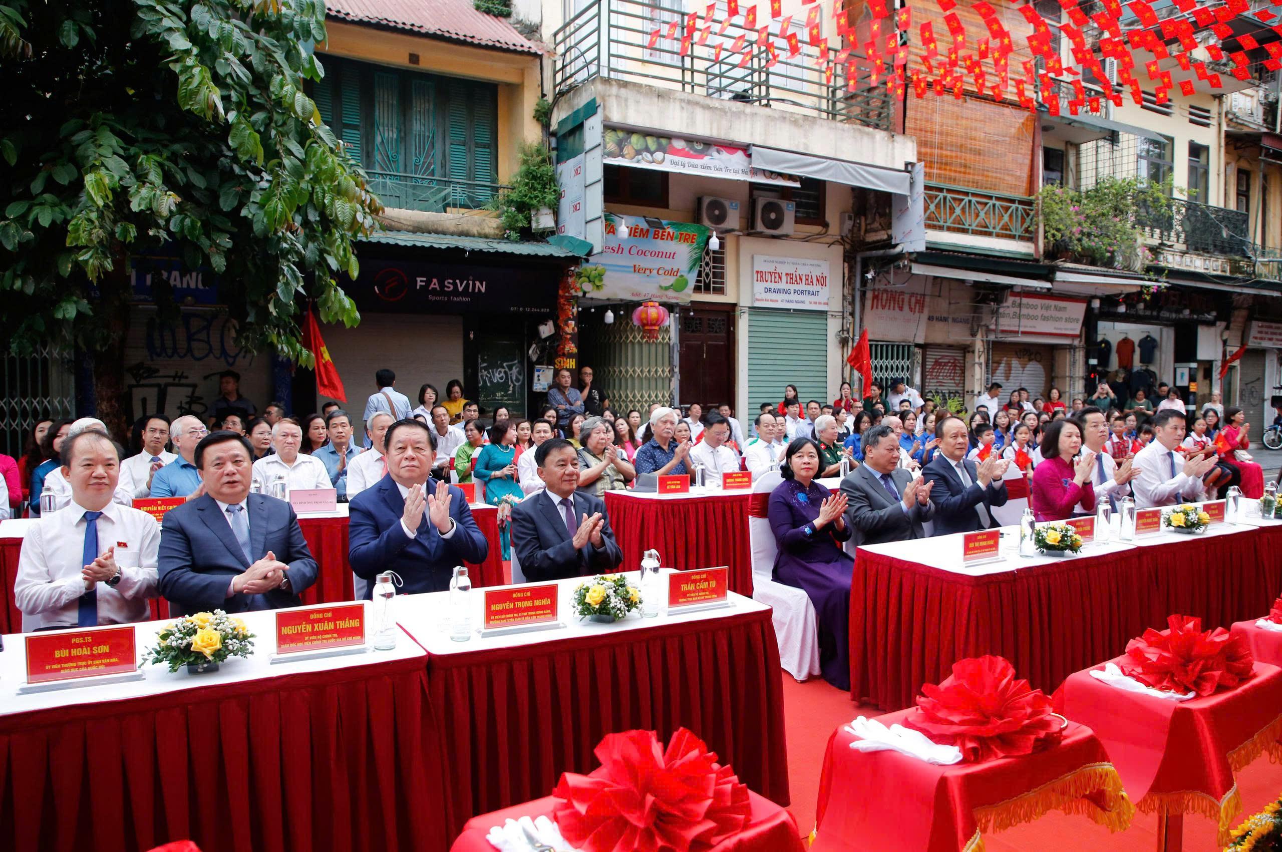 Các đồng chí lãnh đạo Trung ương và thành phố Hà Nội tham dự lễ gắn biển công trình và trưng bày triển lãm tại di tích lịch sử 48 Hàng Ngang