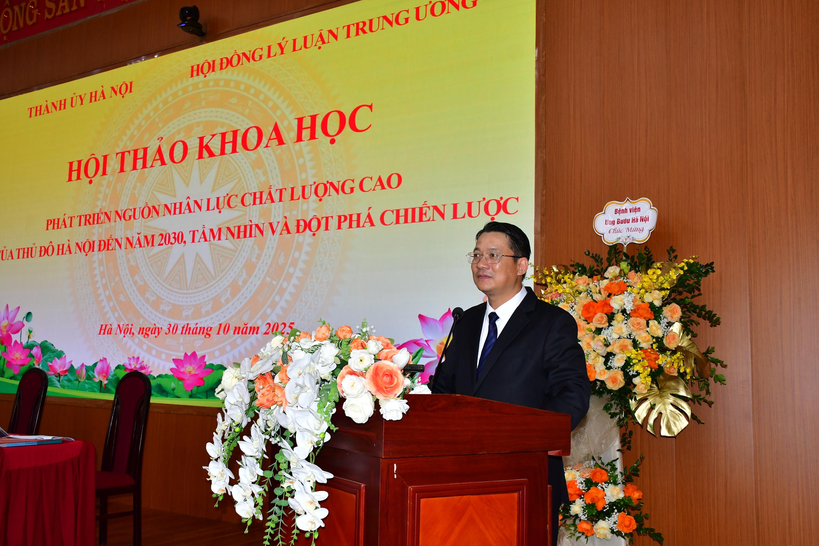 Phát biểu khai mạc và trình bày báo cáo đề dẫn tại hội thảo khoa học, đồng chí Vũ Hà, Thành ủy viên, Phó Trưởng ban Thường trực Ban Tuyên giáo và Dân vận Thành ủy Hà Nội nhấn mạnh: Trong bối cảnh toàn cầu chuyển dịch mạnh mẽ sang nền kinh tế tri thức và kinh tế sáng tạo, nguồn nhân lực chất lượng cao đã vượt lên khỏi khái niệm “yếu tố đầu vào” để trở thành tài sản chiến lược, là nguồn lực nội sinh và động lực then chốt quyết định tốc độ, chất lượng và tính bền vững trong phát triển của Thủ đô.