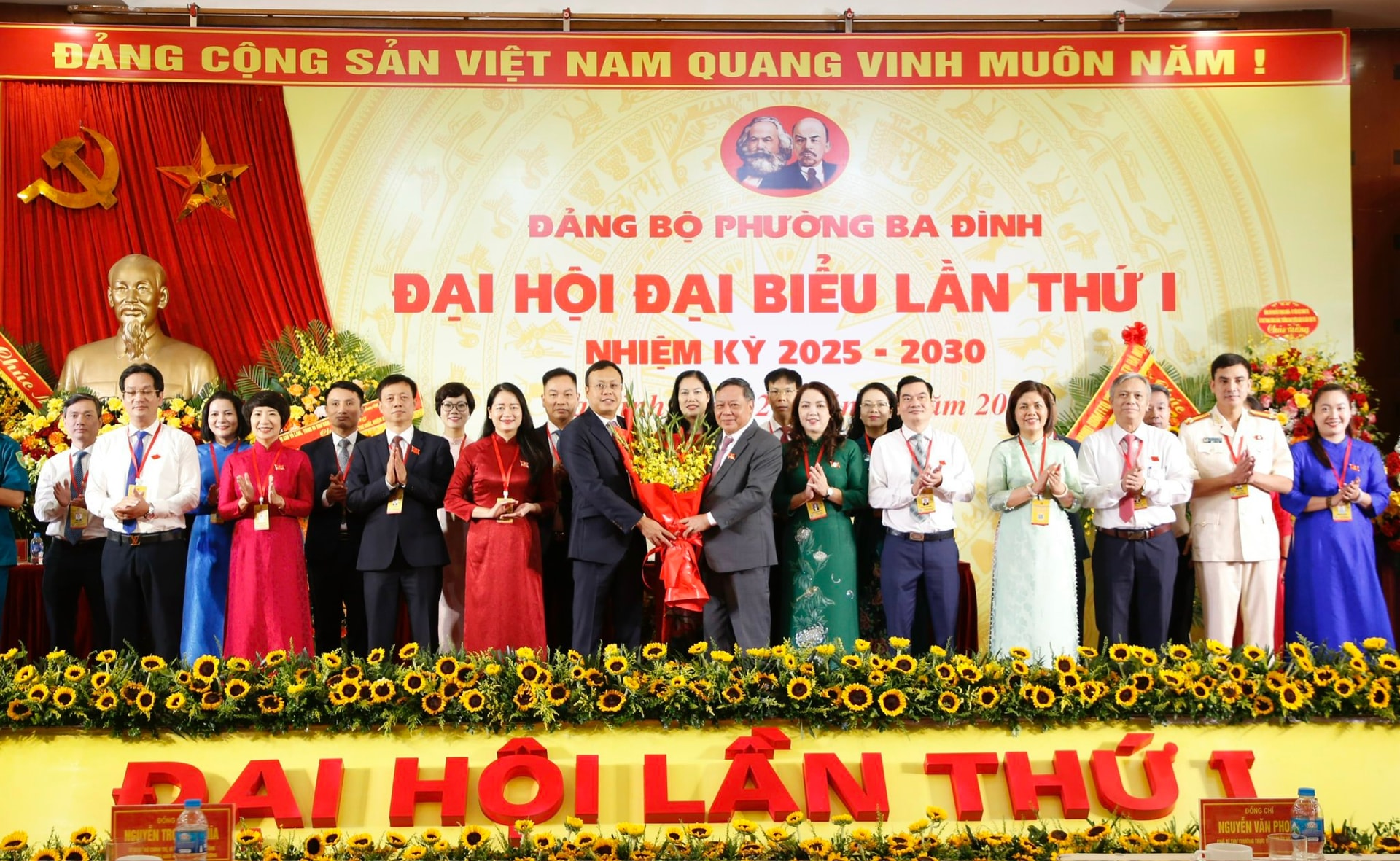 Phó Bí thư Thường trực Thành ủy Nguyễn Văn Phong tặng hoa chúc mừng Ban Chấp hành Đảng bộ phường Ba Đình nhiệm kỳ 2025-2030