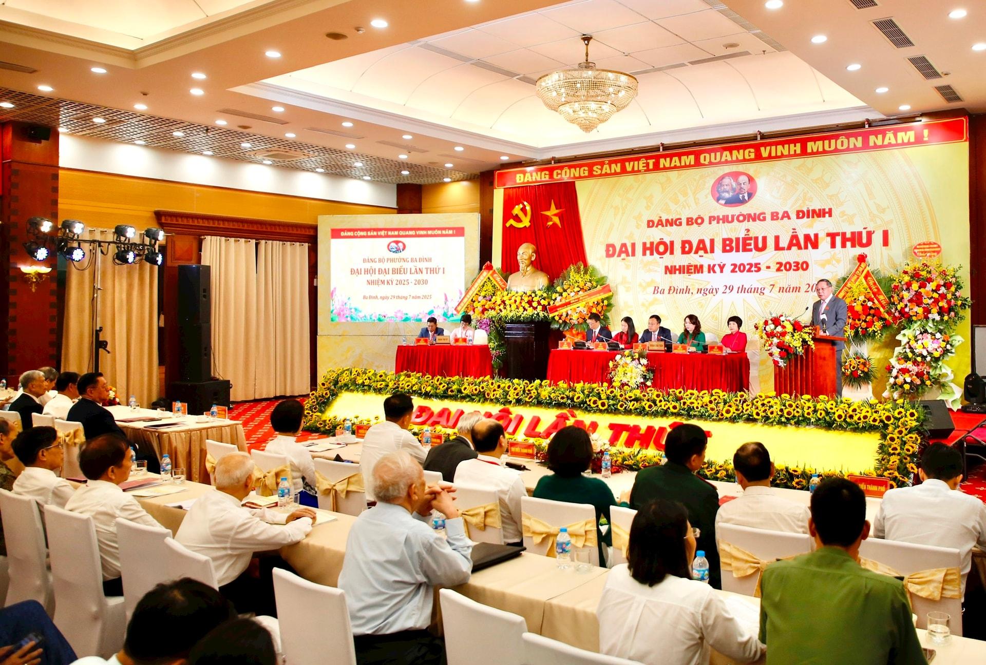 Sáng 29-7, Đảng bộ phường Ba Đình tổ chức Đại hội đại biểu lần thứ I, nhiệm kỳ 2025-2030. Dự Đại hội có Ủy viên Bộ Chính trị, Bí thư Trung ương Đảng, Trưởng ban Tuyên giáo và Dân vận Trung ương Nguyễn Trọng Nghĩa; nguyên Phó Chủ tịch Quốc hội Đặng Quân Thụy; nguyên Phó Bí thư Thành ủy Hà Nội Đào Đức Toàn. Đại biểu thành phố dự Đại hội có Phó Bí thư Thường trực Thành ủy Hà Nội Nguyễn Văn Phong; Thành uỷ viên, Phó Chủ tịch HĐND, Phó Trưởng đoàn đại biểu Quốc hội thành phố Hà Nội Phạm Thị Thanh Mai.