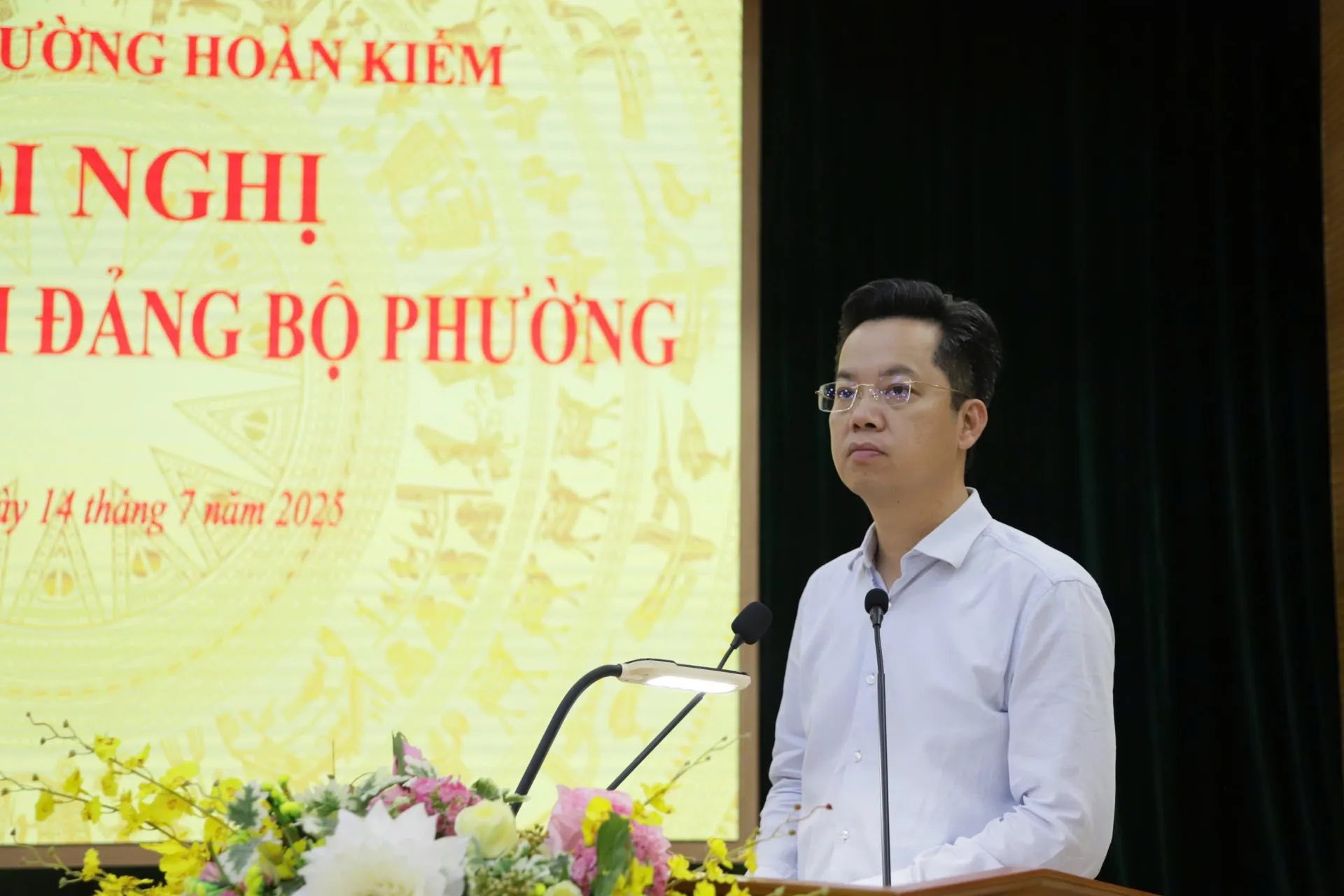 Đồng chí Trần Thanh Quang, Đảng ủy viên, Chánh Văn phòng Đảng ủy phường Hoàn Kiếm trình bày báo cáo tóm tắt dự thảo Báo cáo chính trị trình Đại hội Đại biểu Đảng bộ phường Hoàn Kiếm lần thứ I, nhiệm kỳ 2025–2030 tại Hội nghị