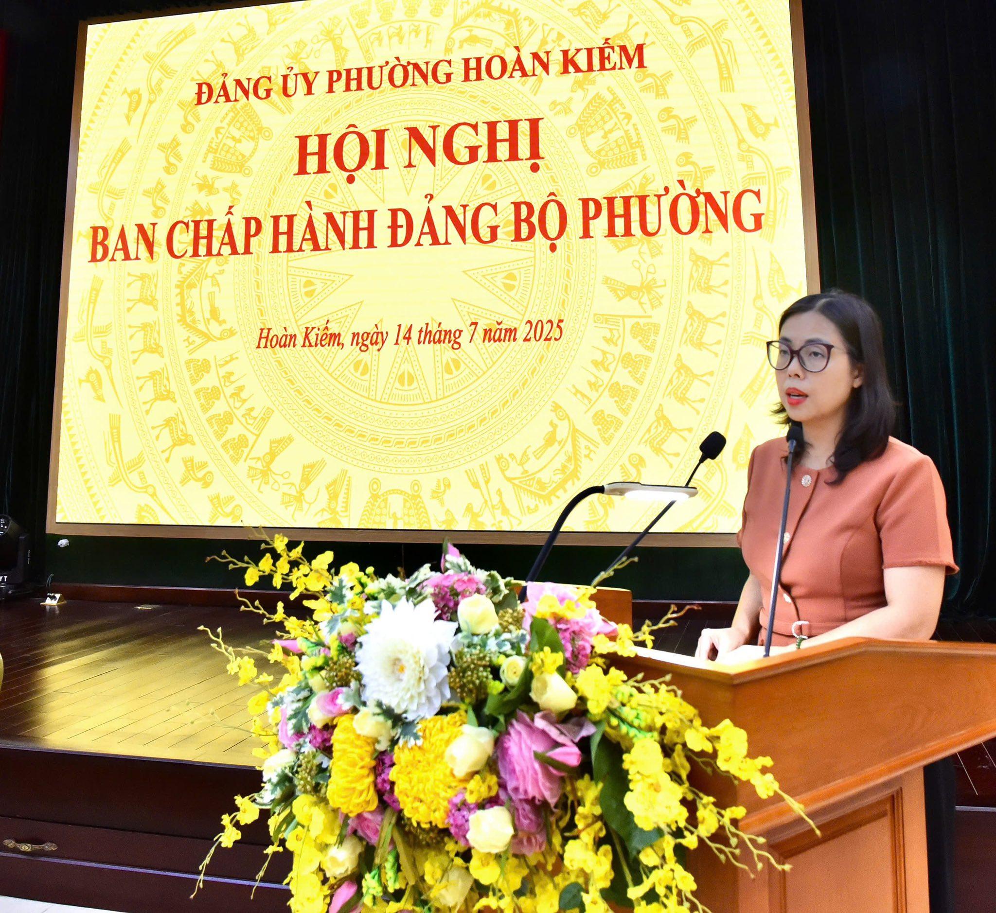 Đồng chí Phùng Phương Thảo, UVTV, Trưởng Ban Xây dựng Đảng phường Hoàn Kiếm báo cáo kết quả công tác chuẩn bị tổ chức Đại hội Đại biểu Đảng bộ phường Hoàn Kiếm lần thứ I, nhiệm kỳ 2025–2030 tại Hội nghị
